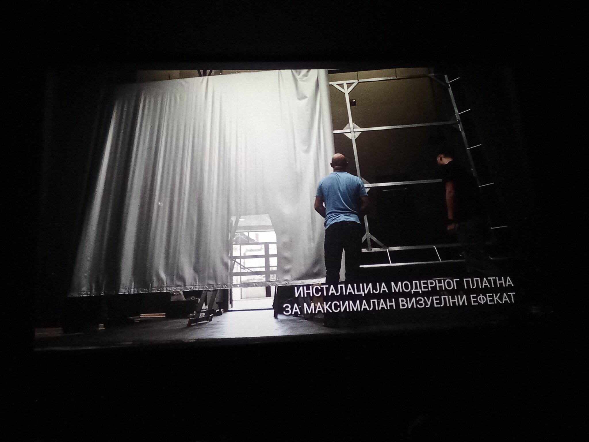 Jao BELI bioskop napravili, Kao pozoriste da je. Trebalo bi Crvena, Zelena ili Plava boja, radi odziva platna, visokog kontrasta, dozivljaja celokupnog i visokog kvaliteta slike. Jer ste radili sve testove slike. Samo bih pitao za platno koje je marke, tipa, koliko je preslo, koliko trosi, da li je bioskopsko hahahaha… Beli bioskop. Beli studio alo…Beli bioskop.