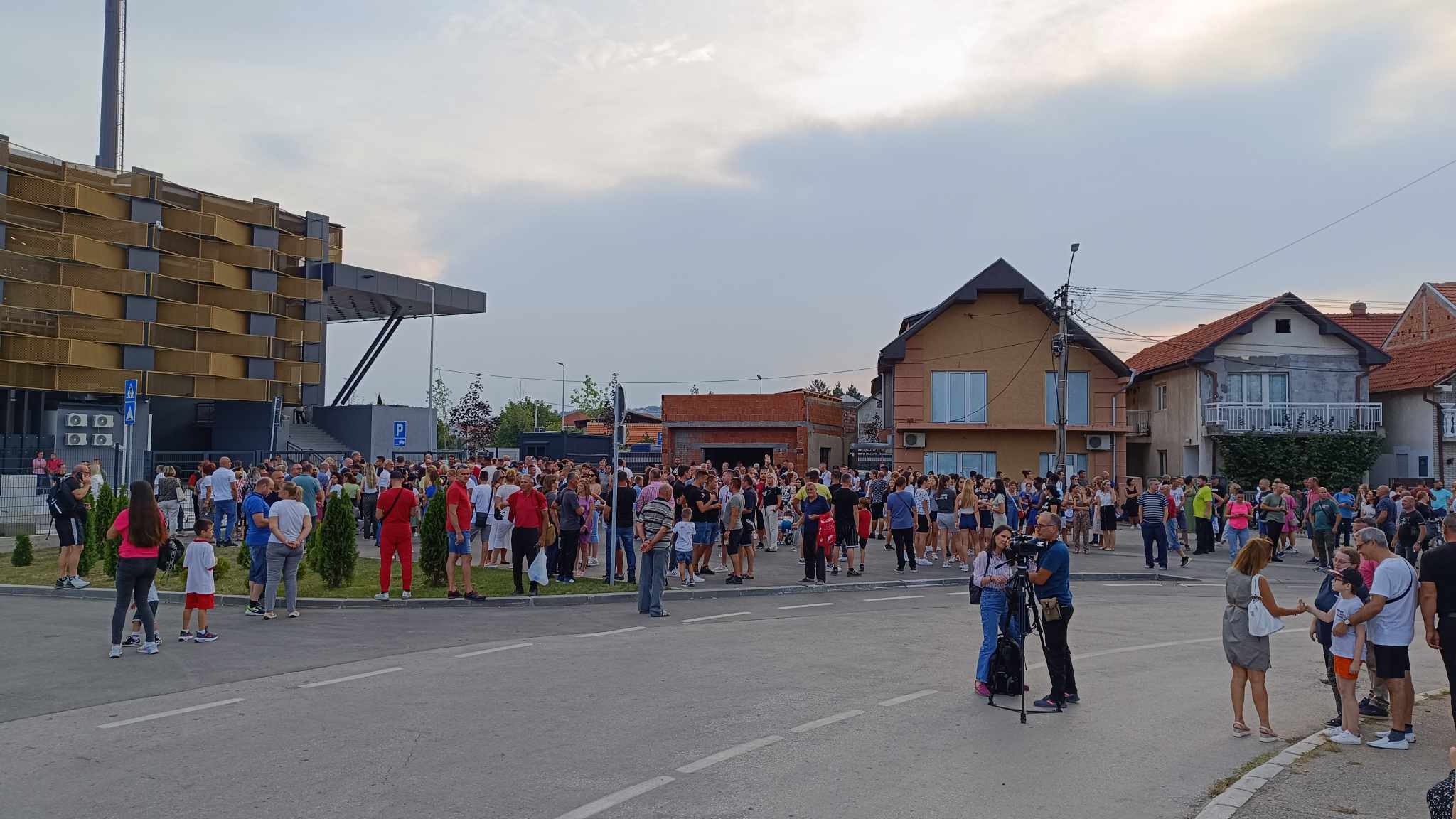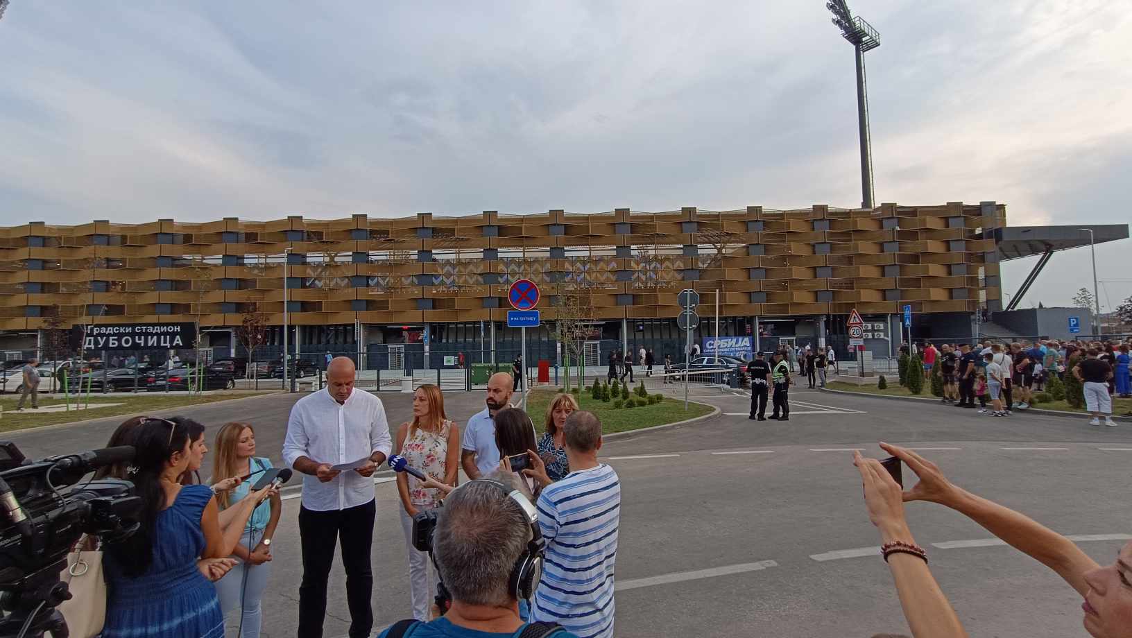 Činovnici iz lokalne samouprave, direktori javnih preduzeća i ustanova sa čitavim porodicama, sportski radnici, deca koja treniraju za gradske klubove, poznati gradski botovi, kao i po koji opozicionar, nalaze se ispred ulaza na novosagrađeni gradski stadion u Leskovcu čekajući predsednika Srbije Aleksandra Vučića. Jedni da mu aplaudiraju, drugi pokušavajući da mu postave niz pitanja.