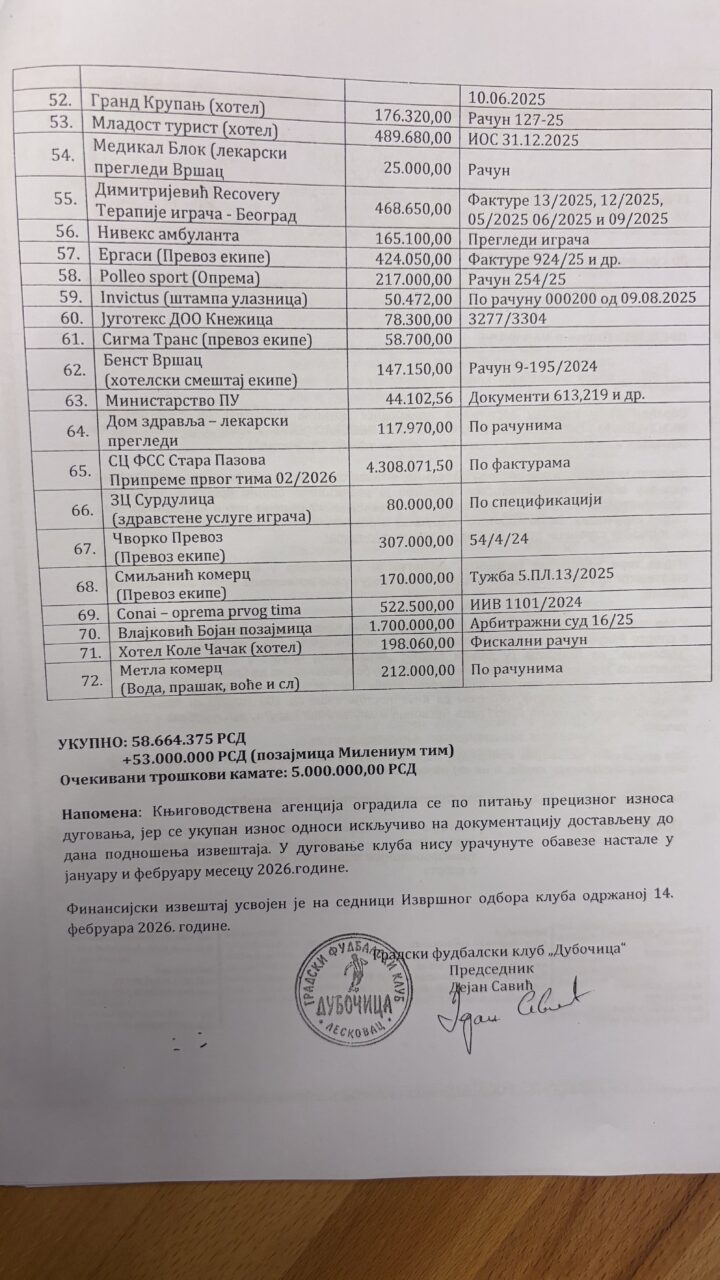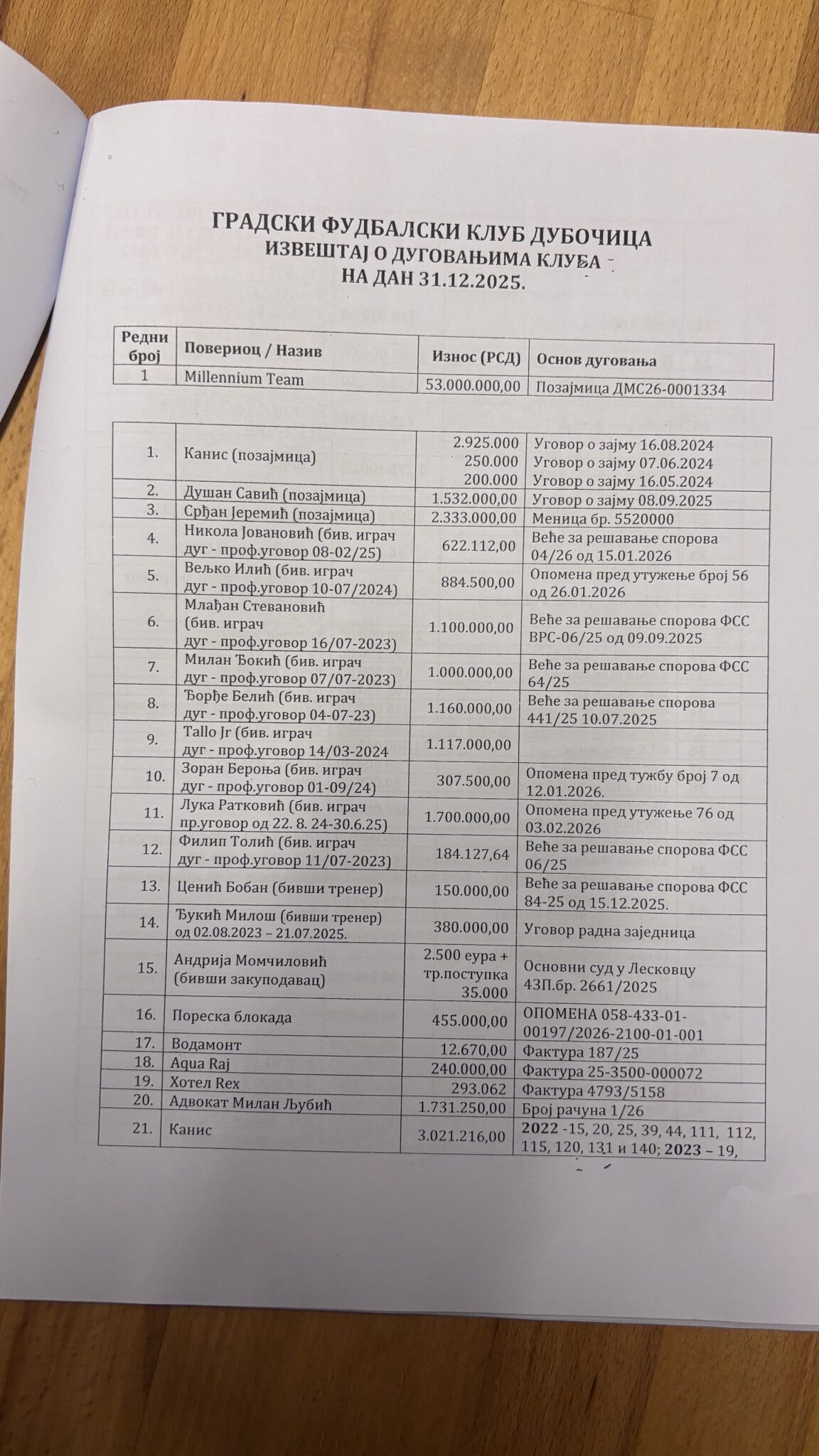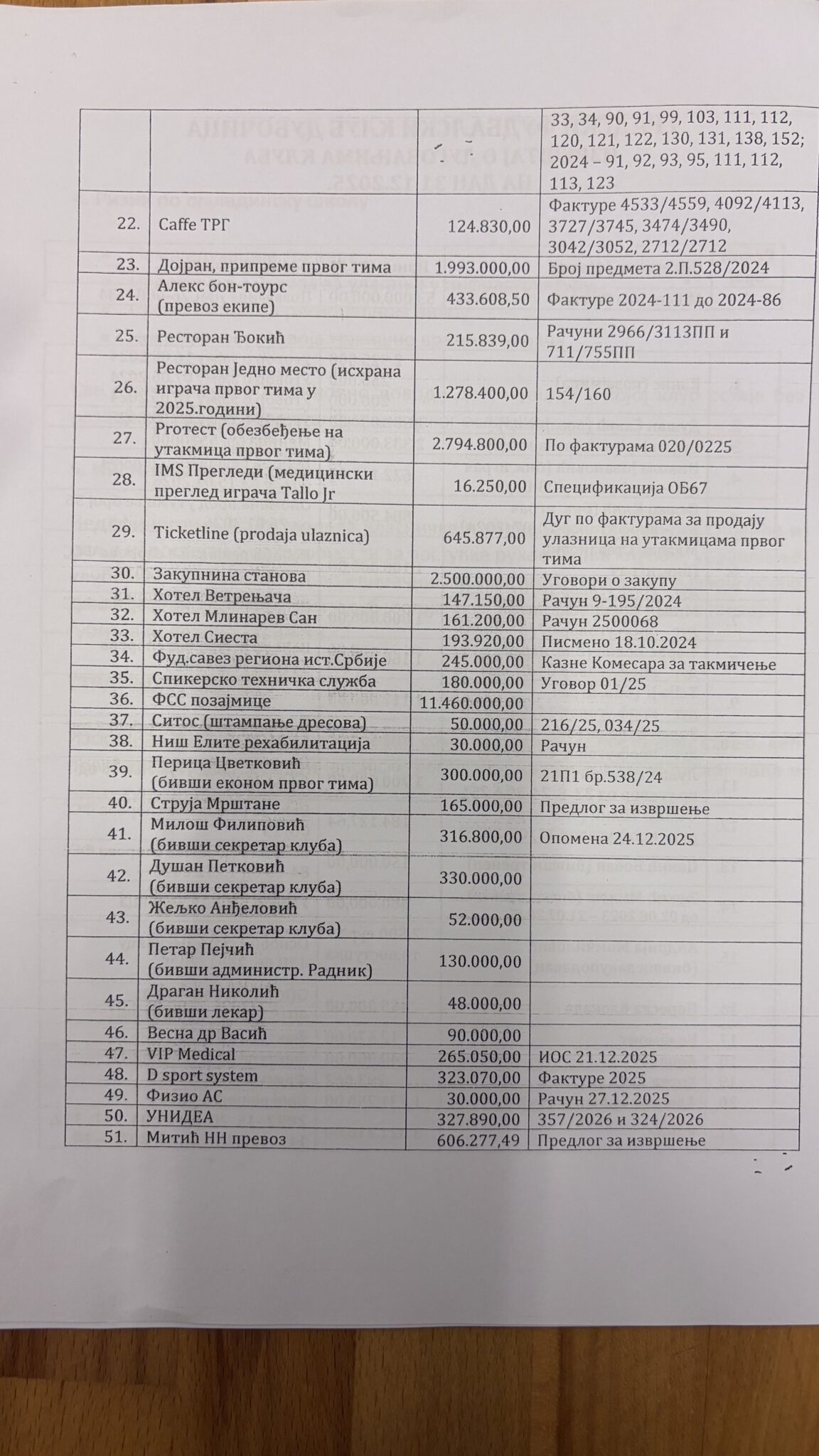 Prema njegovim rečima, dugovi kluba procenjuju se na između 110 i 120 miliona dinara, ali tvrdi da taj iznos nije zvanično utvrđen u postupku pred nadležnim organima, već da je reč o spisku koji je, kako navodi, sastavljen bez jasne verifikacije.