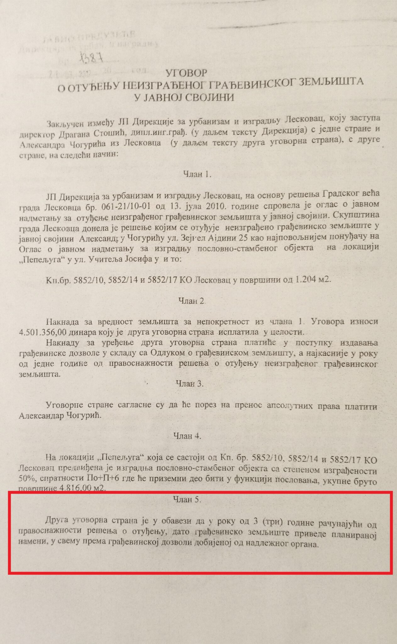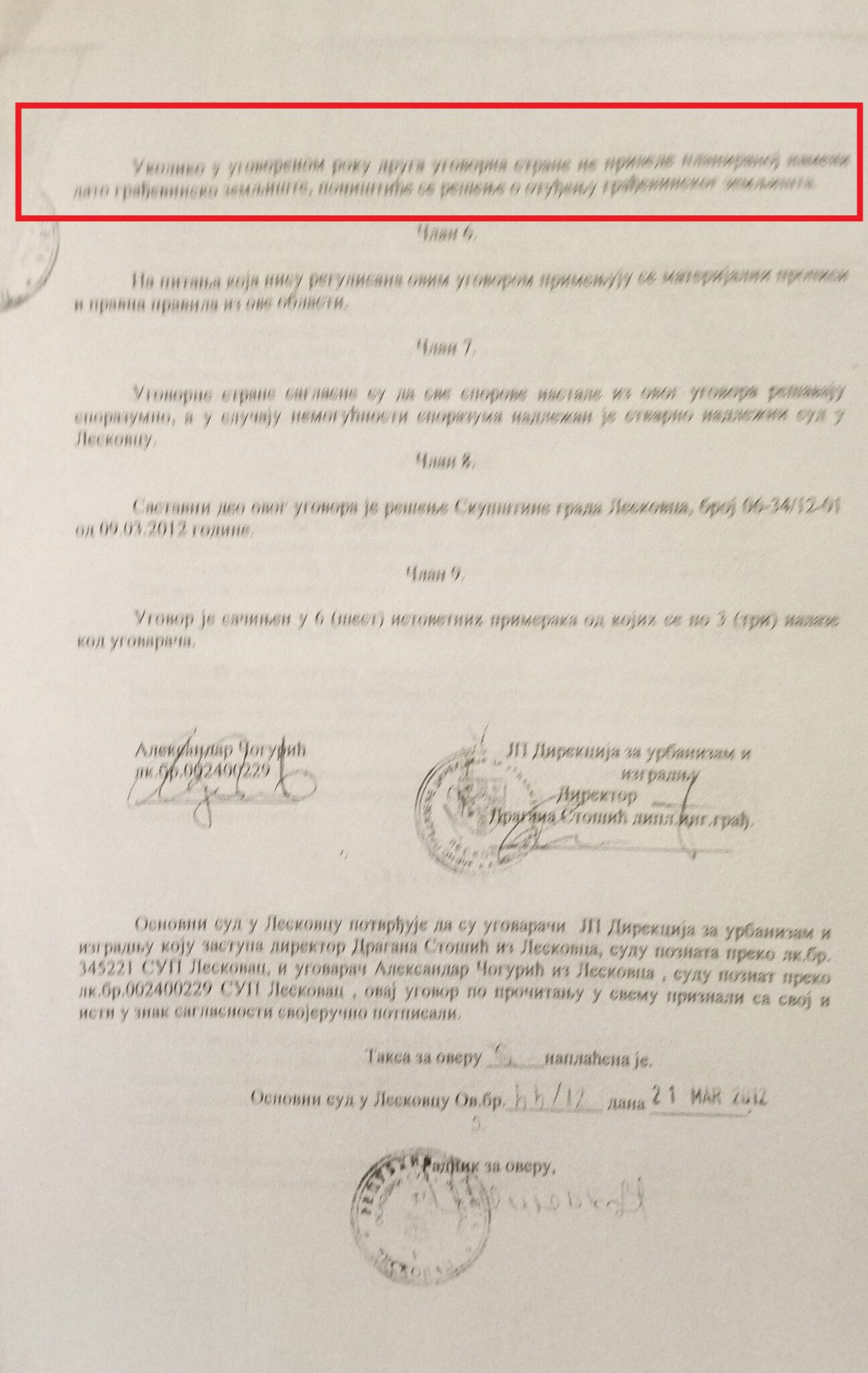 “Grad Leskovac može, ukoliko to lokalne vlasti žele, u svoje vlasništvo da vrati parcelu iza Madere. Naime, u članu 5 Ugovora o otuđenju neizgrađenog građevinskog zemljišta u javnoj svojini, potpisanog 13. marta 2012. godine između tadašnje direktorke JP Direkcija za urbanizam i izgradnju Dragane Stošić i mene piše da je ‘kupac u obavezi da u roku od 3 godine, računajući od pravosnažnosti rešenja o otuđenju, dato građevinsko zemljište privede planiranoj nameni, u svemu prema građevinskoj dozvoli dobijenoj od nadležnog organa. Ukoliko u ugovorenom roku kupac ne privede planiranoj nameni dato građevinsko zemljište, poništiće se rešenje o otuđenju građevinskog zemljišta’. I ja ću to sada da tražim, iako je to trebalo da se uradi još pre šest godina, uz uslov da se tu ne zid nikakva zgrada. Parcela je moja, i ja sam je kupio upravo iz razloga što je tu neko predvideo da se pravi stambena zgrada. Ja baš nisam hteo da se tu bilo šta zida jer su mi tu bile kancelarije. Na prvoj licitaciji se niko nije javio, na drugoj sam ja kupio tu parcelu”, priseća se Čogurić.