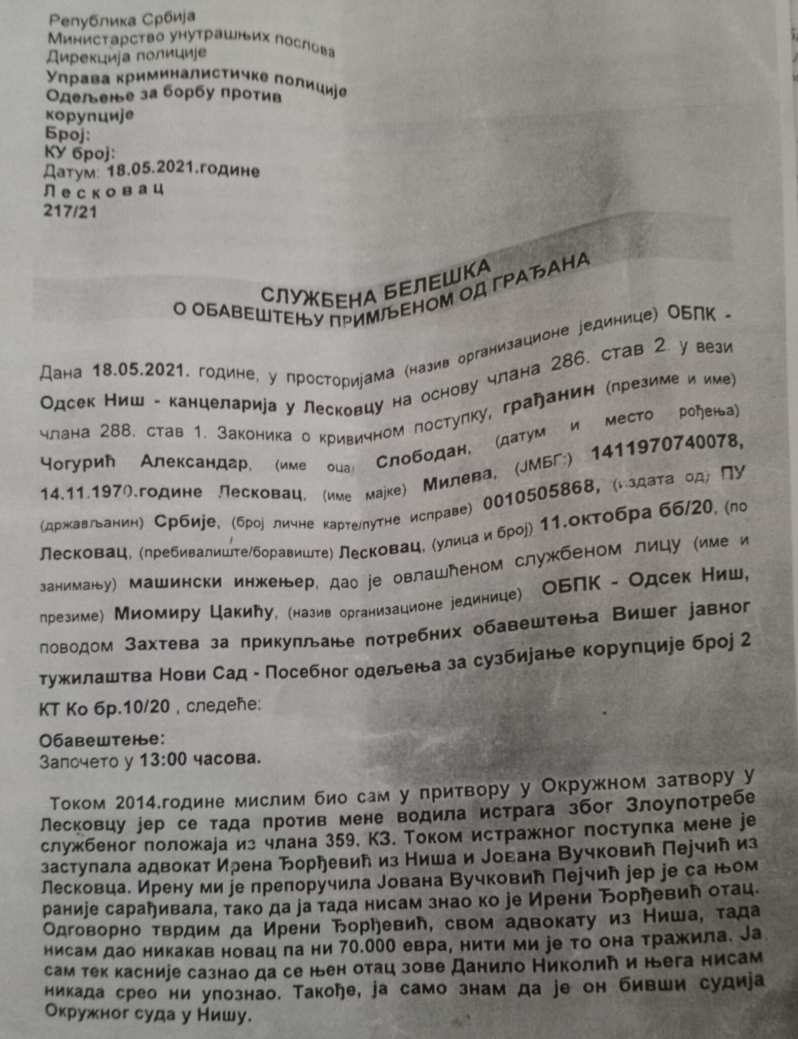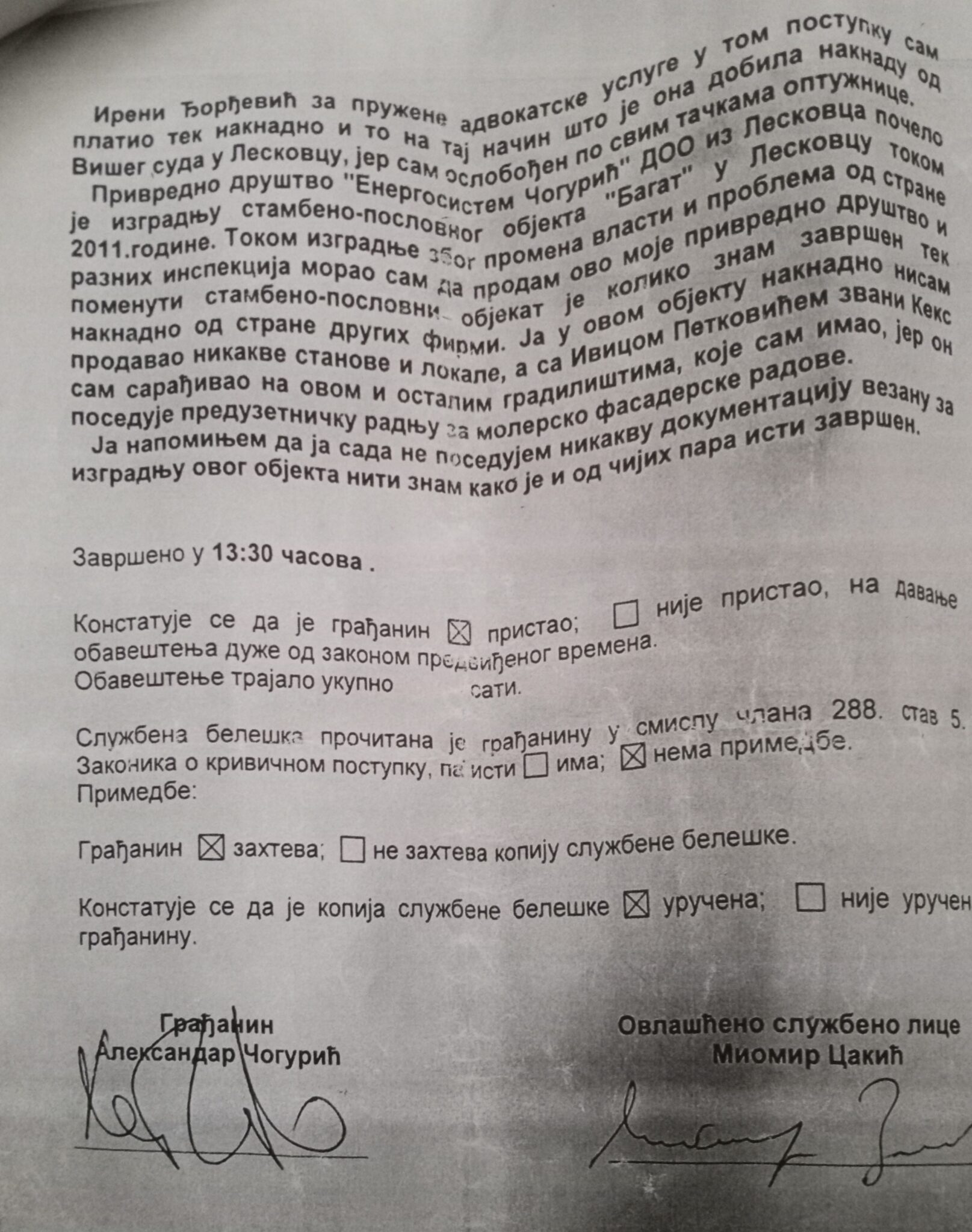 “Gandi je meni tada lično rekao da je on to morao da uradi i da gradi po nalogu BIA. On mi je to kazao u prisustvu deset ljudi na pauzi sastanka Komisije, koji se odvijao u gradskoj kući. Izašao je počeo da vice na mene, šta se ja zamišljam, da je on još 2013. godine učestvovao u otimanju moje imovine, u analizi svih dokumenata šta sam ja radio van zakona, i da nisu uspeli da me osude tada na sudu, gde je i on bio jedan od advokata u tom postupku, da on sve vreme radi za policiju, za sud, za vlast i Srpsku naprednu stranku, te da tada nije uspeo da pronađe tu parcelu jer sam je sakrio, ali da su je sada našli, da su išli sa policijom kod njih, i sad će oni tu da grade. Galamio je, ceo kabinet, sve one radnice su izašle, i svi su ga slušali. Ja sam bio na toj Komisiji gde su dali predlog da se gradi na spornoj parceli, u svojstvu građanina. Interesantno je da je projekat za gradnju radio Milenko Milenković, čovek koji je bio član te komisije, a sećate se, i bivši direktor Direkcije za urbanizam i izgradnju. On je bio direktor Direkcije u onom period kada je zakonski trebalo da raskine taj ugovor o kupovini samnom. Taj Milenković je kao član ove Komisije izradio projekat za gradnju na parceli, na svim tačkama dnevnog reda tadašnje sednice je bio član iste komisije, za tu tačku se izuzeo, pa je izašao da on brani projekat, da bi na sledećoj tački ponovo bio član Komisije. Ja ne znam da li to u Kolumbiji ima. Katastrofa jedna obična. Nakon toga su me udaljili sa sednice, jer sam se bunio. Čim sam se udaljio sa sednice zvao sam svog advokata koji je advokat i firme ‘Baagdala graditelj’ čiji je vlasnik tu došao i nastavio da se bori protiv gradnje na tom delu parcele. Da nije on došao, mislim, da bi dobili dozvolu za gradnju. Srećom, i on se svađao sa njima i mislim da su to obustavili, pa su tražili neko mišljenje Direkcije. Oni će to da izguraju i mimo njegove volje. Sad će da krenu i u hajku na Bagdalu pošto je stao na moju stranu, iako on i ja ne razgovaramo privatno. Oni hoće to da sagrade na silu, ali ne znam kako će im to poći za rukom. Direkcija i grad Leskovac morali su da prate realizaciju ugovora i da, pošto on nije ispoštovan, uđu u njegov poništaj. Sve pravne radnje u vezi poništenja ovog ugovora mogu da se preduzmu i sada. Pravno gledano, ovaj ugovor je oboriv, ali to je već pitanje za grad i pravobranioca”, zaključuje Čogurić.