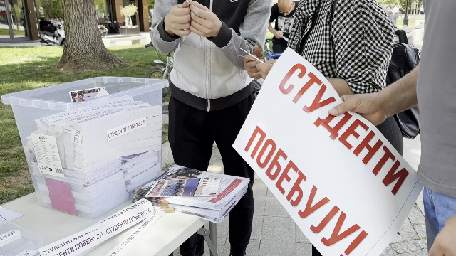 U Leskovcu, kao i širom Srbije, u podne je počela akcija podele nalepnica „Studenti pobeđuju“, a na nezavršenom gradskom trgu, studentski štand je odmah privukao pažnju prolaznika.