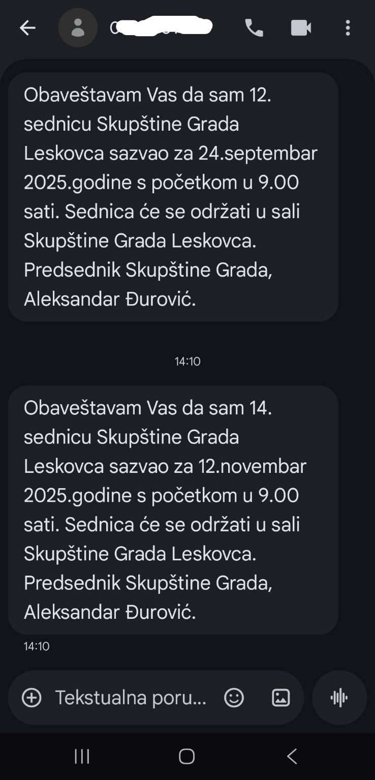 Predsednik Skupštine grada Leskovca Aleksandar Đurović već duže vreme praktikuje da odbornike obaveštava o zasedanjima lokalnog parlamenta putem SMS poruka i to ništa ne bi bilo sporno da o jednoj nije obavestio ama baš nikog i ne zna se da li je uopšte održana.