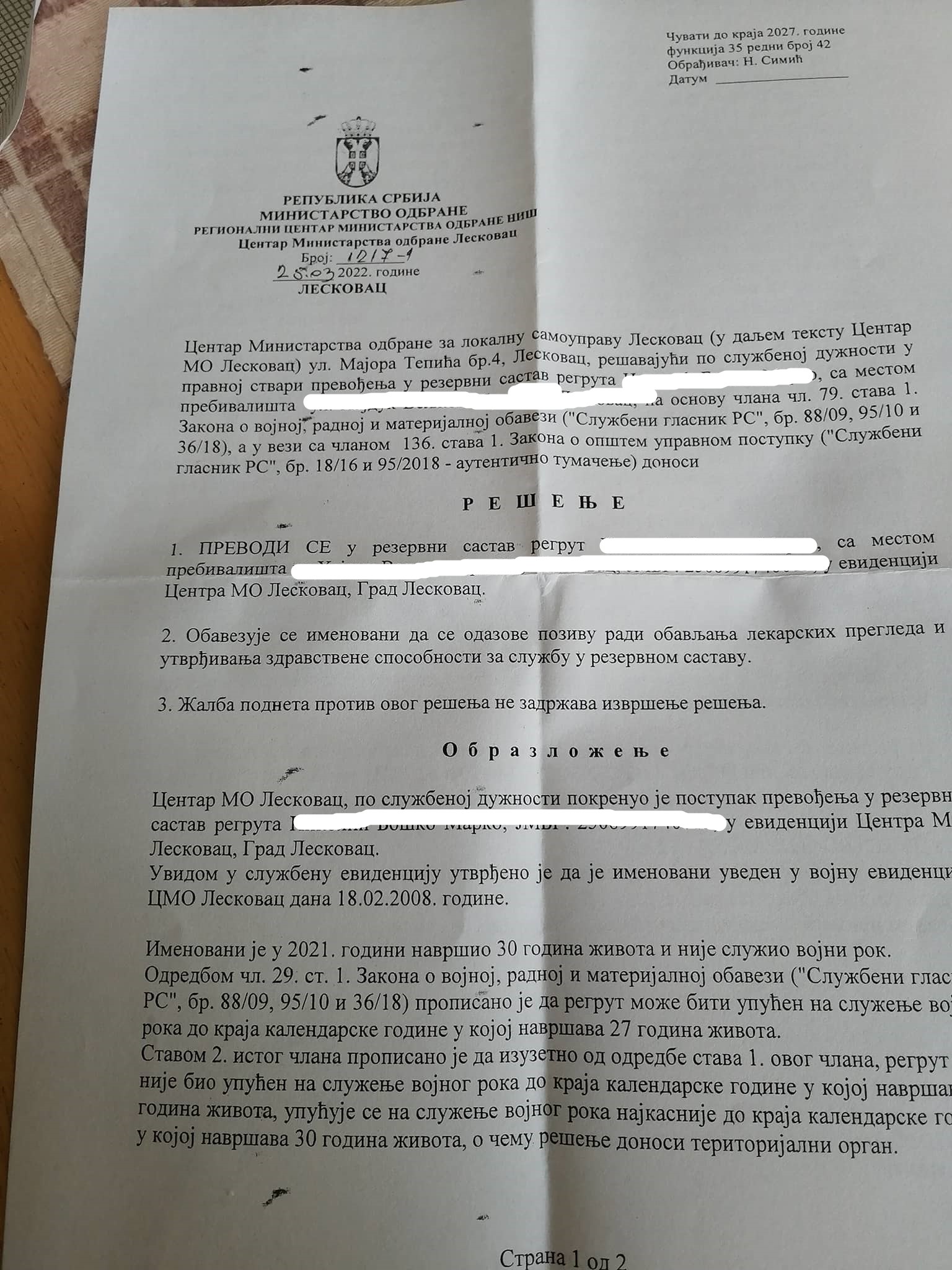 Da, resenje za rezervistu i ratni raspored, da bi nakon 3 4 meseca dobio poziv za Vulinovu specijalnu jedinicu, odnosno 2 sluzenja roka, Sinkovce i Pozarevac po 15 dana.. To se desilo nama pre 2 godine, nakon cega smo pod pretnjom sa 50000 din sa svakim odbijanjem sluzenja „vojnog roka“ prosli obuku. Pozivi za tu obuku su već spremni, tako da 88, 89 godište sigurno idu na obuku za sada..