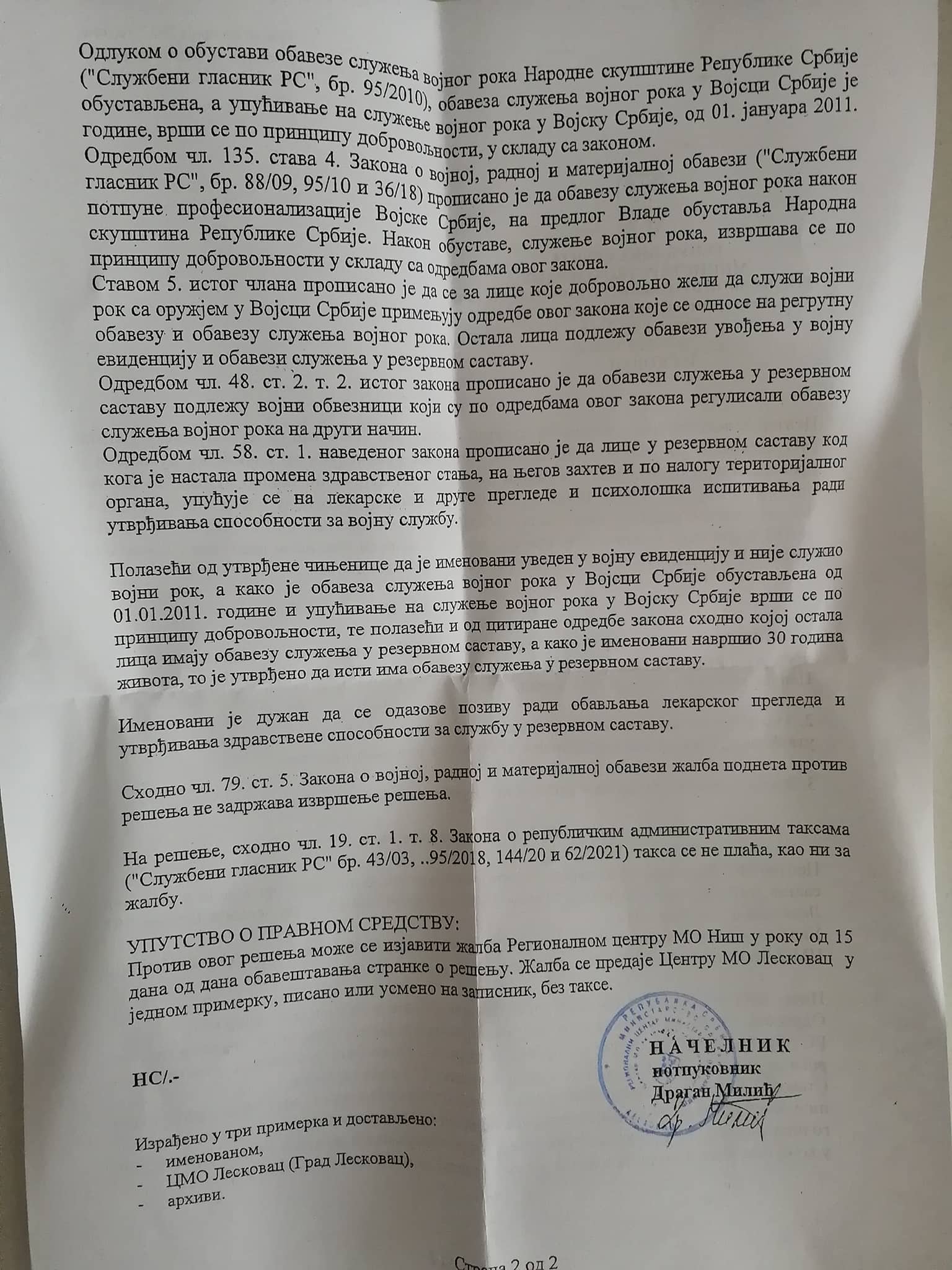 Poštovano uredništvo za sva nejasna pitanja slobodno lično dođite u prostorije Centra Ministarstva odbrane Leskovac u ul. Majora Tepića br.4 gde će Vam sve biti objašnjeno.