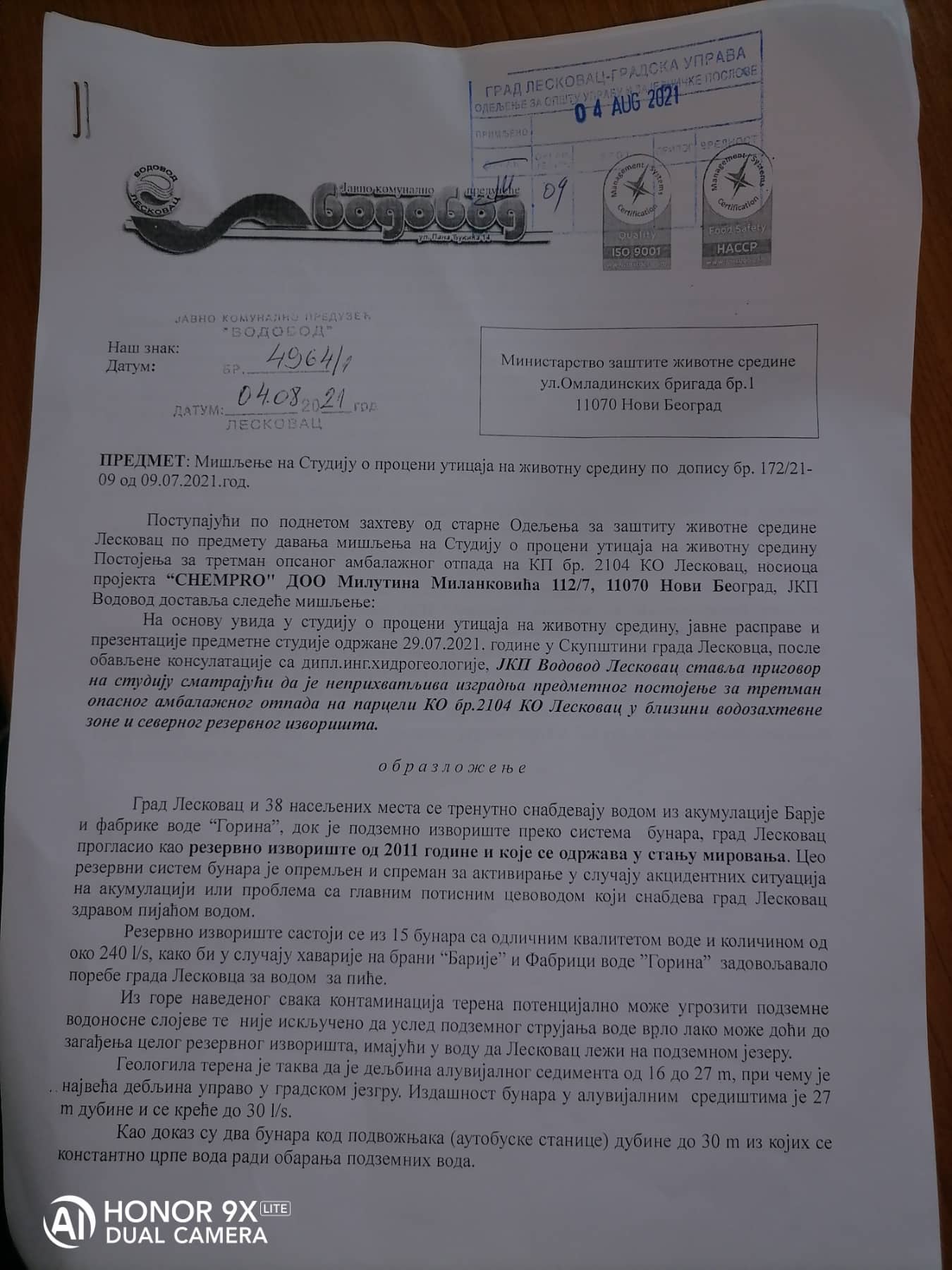 Odluka je, uvidom u rešenje, doneta u aprilu mesecu ove godine, bez obrzira na negativno mišljenje leskovačkog “Vodovoda” i gradskog Odeljenja za zaštitu životne sredine.