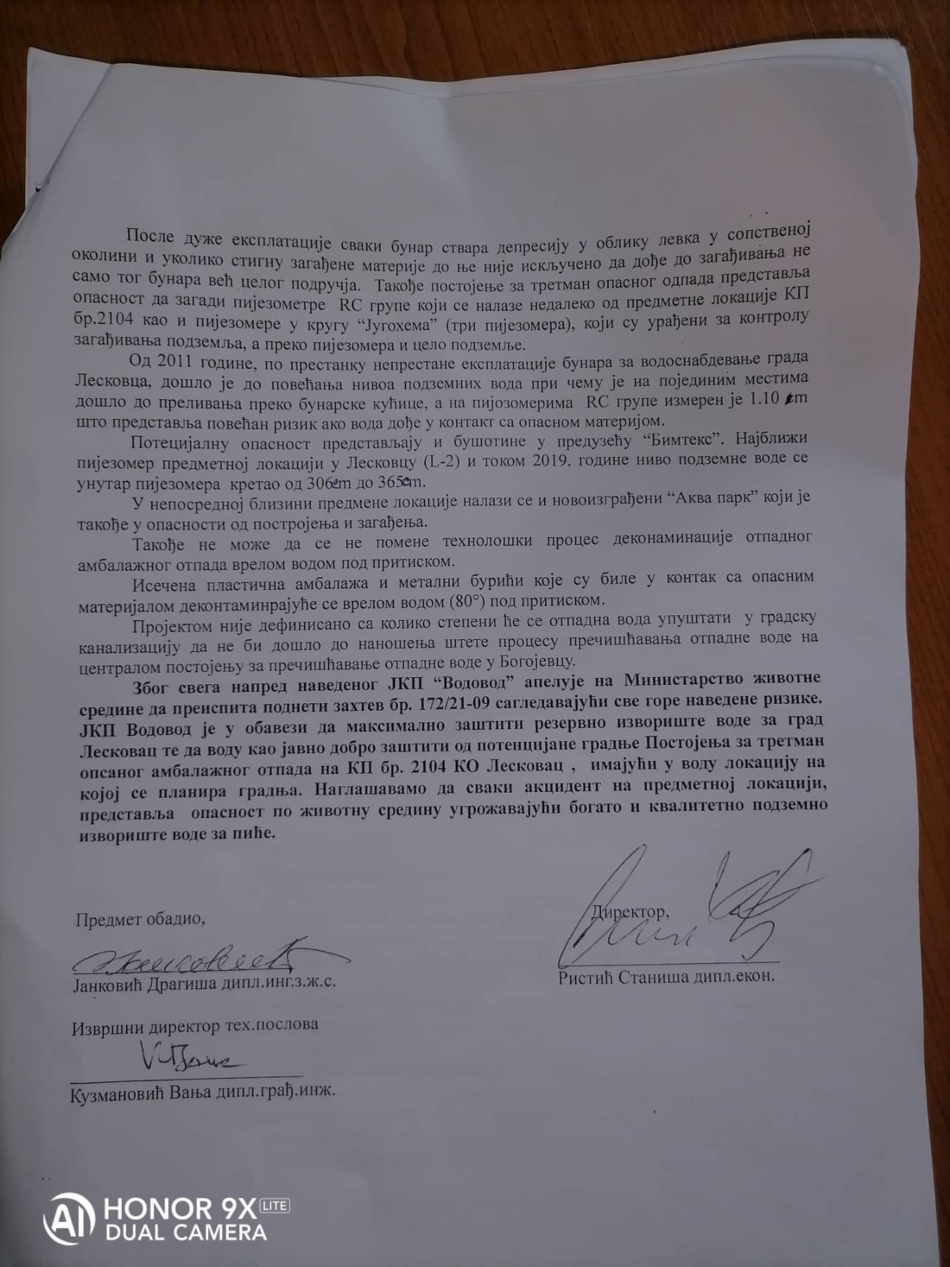 “Apelujemo na Ministarstvo životne sredine da preispita podneti zahtev sagledavajući sve navedene rizike. JKP Vodovod je u obavezi da maksimalno zaštiti rezervno izvorište vode za grad, te da vodu kao javno dobro zaštiti od potencijalne gradnje Postrojenja za tretman opasnog ambalažnog otpadaa, imajući u vidu lokaciju na kojoj se planira izgradnja. Naglašavamo da svaki akcident na predmetnoj lokaciji predstavlja opasnost po životnu sredinu ugrožavajući bogato i kvalitetno podzemno izvorište vode za piće”, navodi se na kraju dopisa stručnjaka iz gradskog “Vodovoda” upućenom nadležnom ministrastvu.