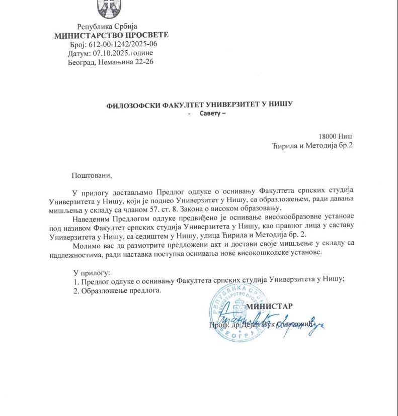 Iako je, formalno, zatraženo mišljenje Filozofskog fakulteta o predlogu za osnivanje nove visokoškolske ustanove, čini se da je odluka već doneta, jer u dopisu Savetu FF, zna se koje će departmane imati Fakultet srpskih studija i na kojoj će mu adresi biti sedište. Zna se, pišu pojedini mediji, već i ime dekana