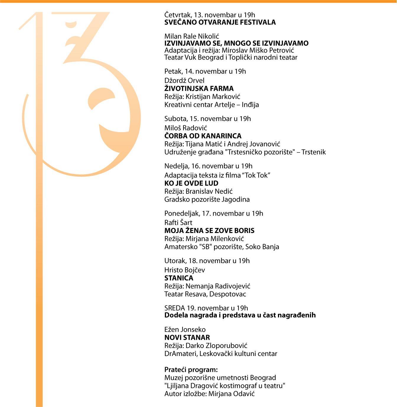 U takmičarskom programu biće odigrano pet predstava koje je selektovao Miodrag Dinulović, pozorišni reditelj, a na zatvaranju, revijalno će biti odigrana predstava DrAmatera Leskovačkog kulturnog centra „Novi stanar“ Ežena Joneska, u režiji Darka Zloporubovića.