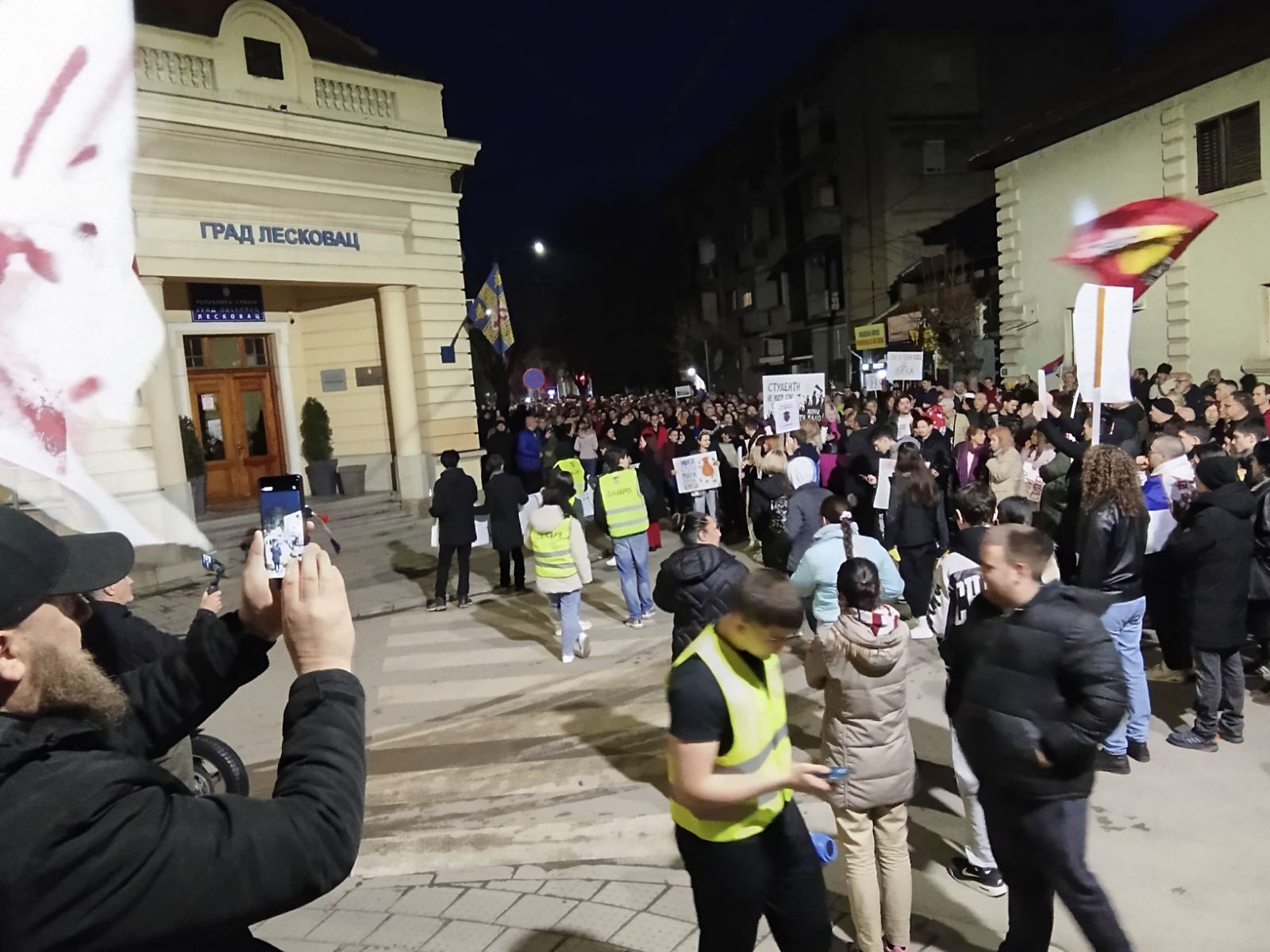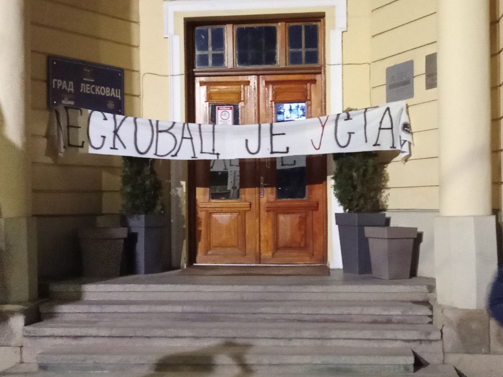 Transparent „Leskovac je ustao“, koji već nedeljama u protestnim šetnjama nose leskovački gimnazijalci, tokom verešanje je zakačen na ulazu u zgradu lokalne samouprave gde se nalazi kabinet gradonačelnika Gorana Cvetanovića, ali i Skupština grada.