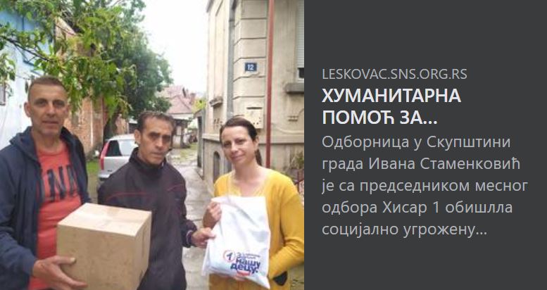 “Aktivisti sledećih mesnih odbora: Kozare, Tupalovce, Kovačeva bara, Palojce, Bojišine, Mala Kopašnica, Slatina, Mala Grabovnica, Grdelica i Robin Del, proteklog vikenda delili su humanitarne pakete sa osnovnim životnim namiricama u njihovom kraju porodicama koje su u stanju socijalne potrebe. Podelili su ukupno 60 paketa pomoći”, navedeno je na zvaničnoj internet stranici ove stranke.