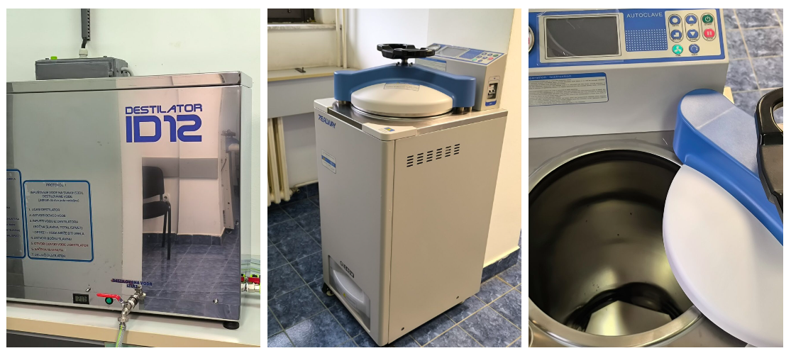 Autoklav služi za sterilizaciju laboratorijskog pribora i uzoraka pod visokim pritiskom i temperaturom, čime se obezbeđuju higijenski ispravni uslovi rada, dok destilator proizvodi visokokvalitetnu destilovanu vodu neophodnu za izvođenje brojnih laboratorijskih analiza.
