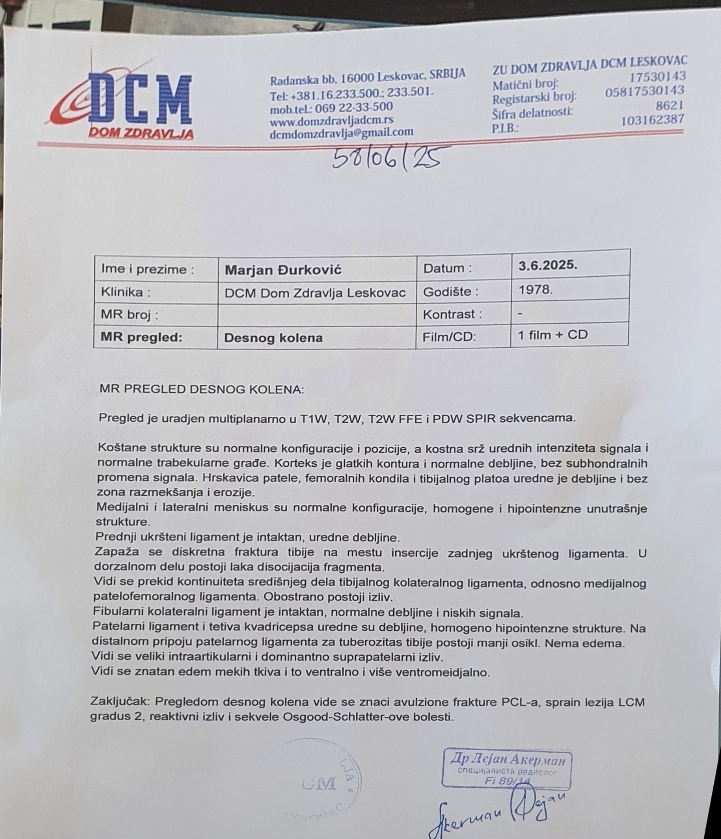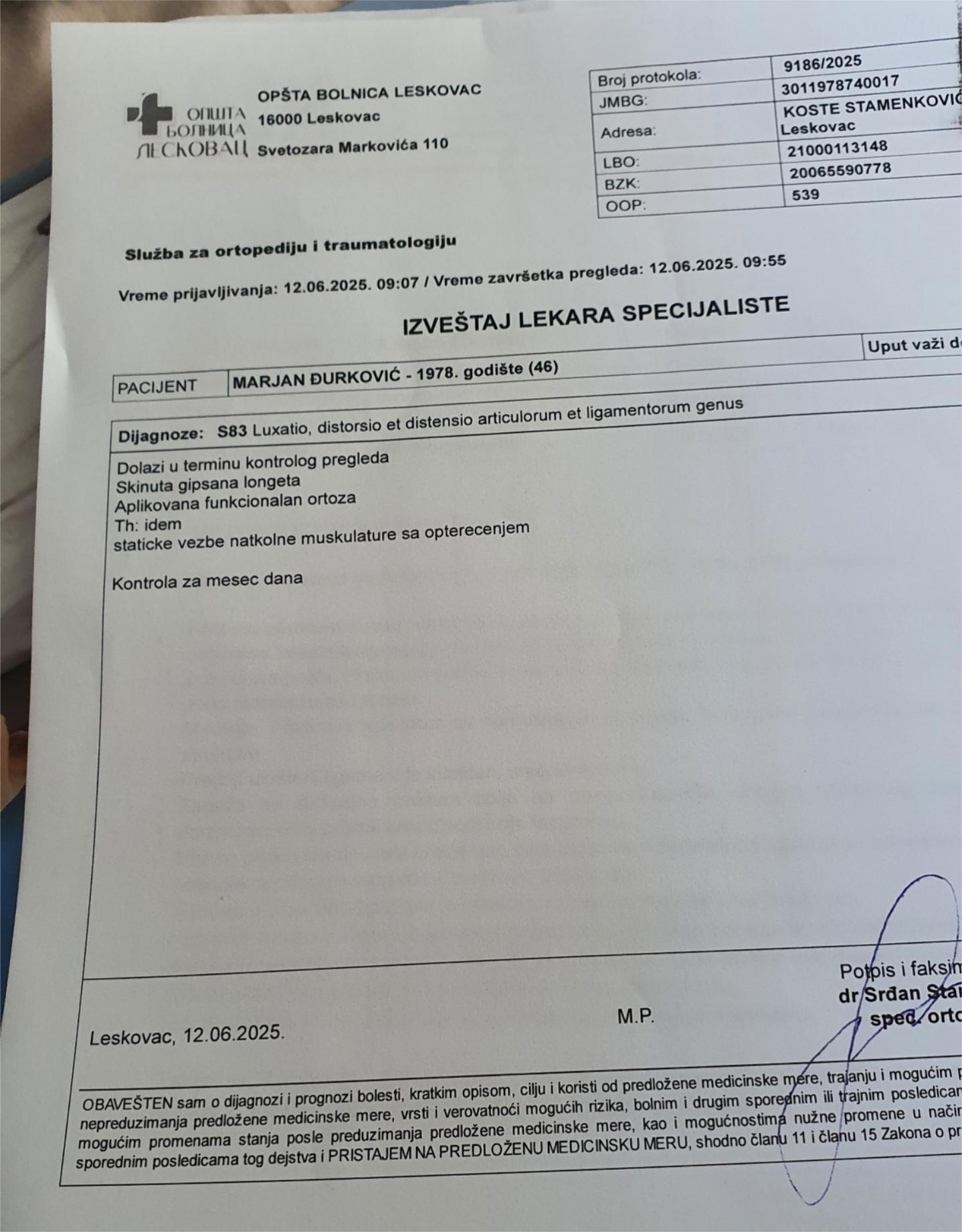 U prilog izjavi, Đurković prilaže zdravstvenu dokumentaciju sa dijagnozom, terapijom i preporukom lekara da povređena noga mora stajati isključivo u horizontalnom položaju.