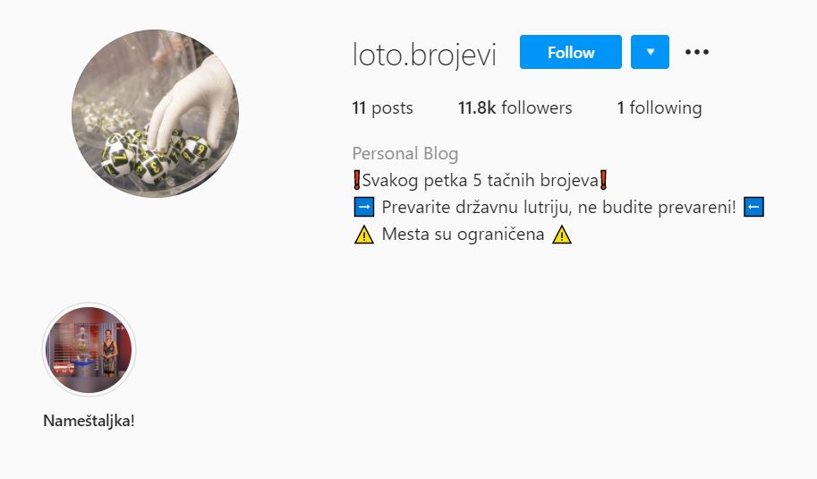 U saopštenju je navedena i adresa profila „koji se bavi ovom prevarom“: https://www.instagram.com/loto.brojevi/.