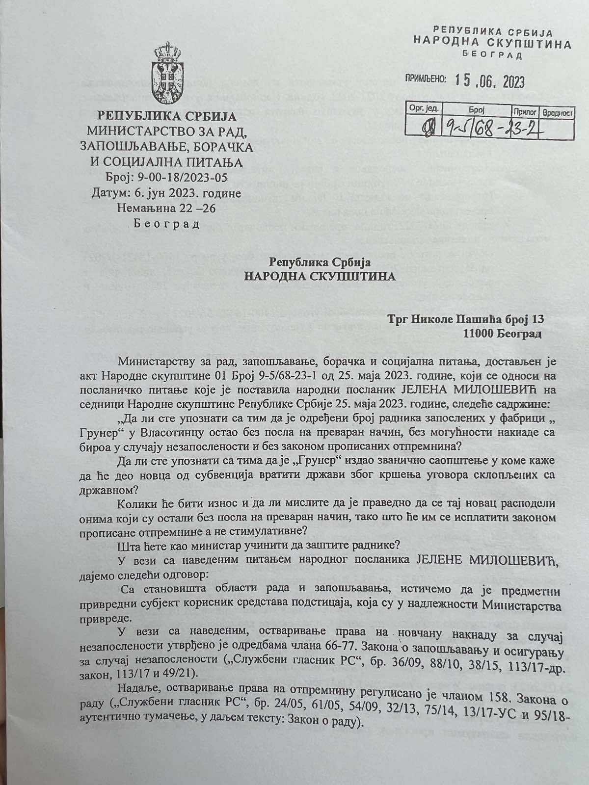 Opoziciona narodna poslanica Jelena Milošević upozorava da je fabrika ‘Gruner’po potpisanom sporazumu sa opštinom Vlasotince bila u obavezi da zaposli 200 radnika i nikog ne otpusti u roku od pet godina od datih subvencija.