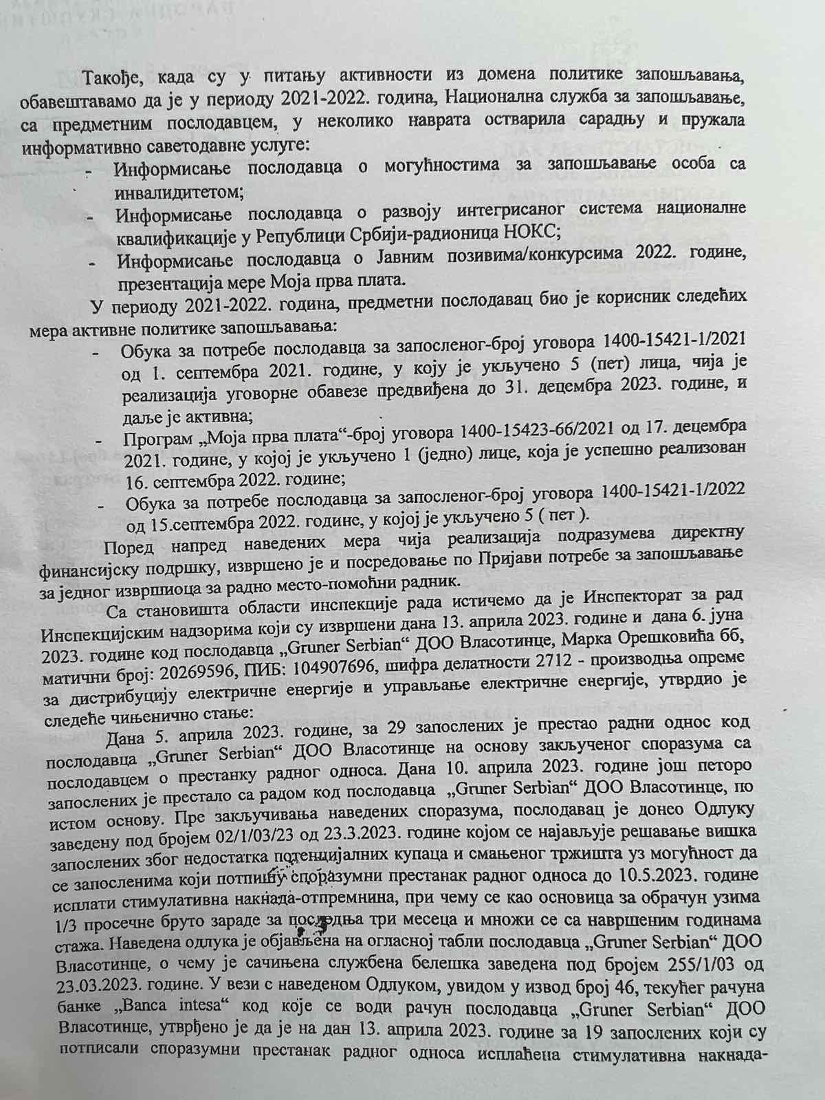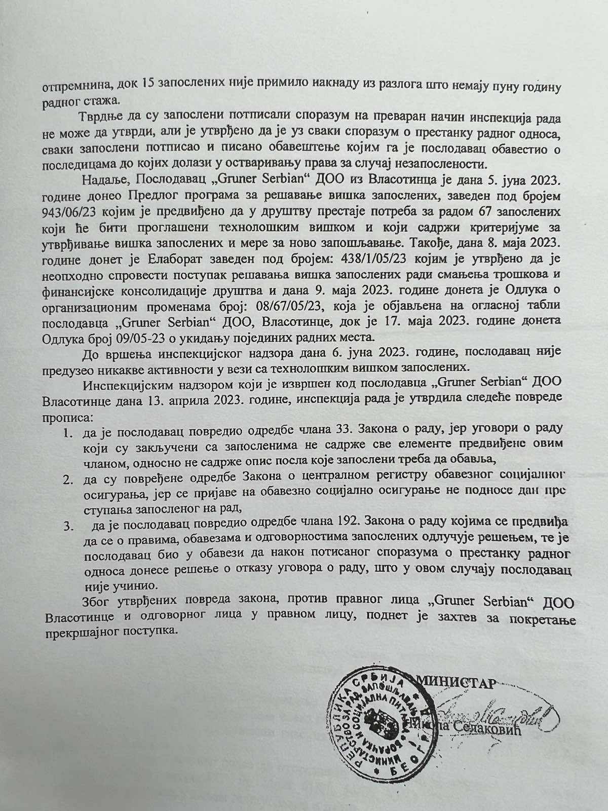 “Gruner” je bio u obavezi da nakon potpisivanja sporazuma o prestanku radnog odnosa donese rešenje o otkazu ugovora o radu, što poslodavac nije učinio, čime je prekršio Zakon o radu zvog čega je protiv njih podnet zahtev za pokretanje prekršajnog postupka.