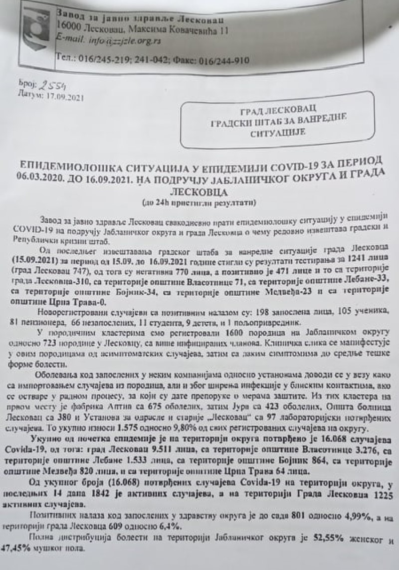 Vršilac dužnosti direktora Zavoda za javno zdravlje Leskovac Ivan Sokolović objavio je danas podatke da je u poslednje dve nedelje na teritoriji Jablaničkog okruga zabeleženo 1.842 slučaja, te da je do sada najveći broj zaraženih u Aptivu – 675, zatim 423 u Juri, 380 u Opštoj bolnici Leskovac i 97 u Ustanovi za odrasle i starije u Leskovcu.