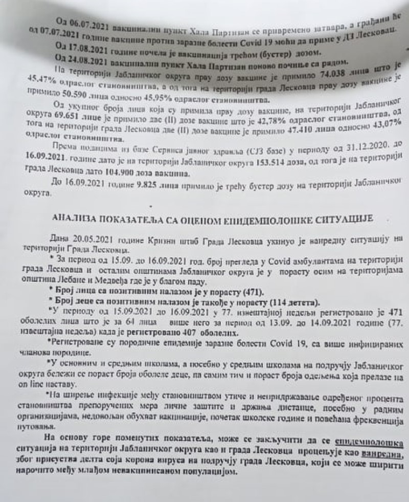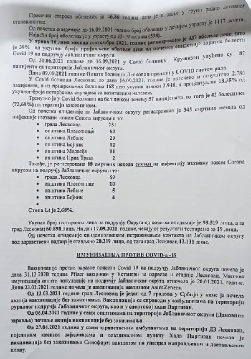 Nakon sednice Gradskog štaba za vanredne situacije, podsetimo, pitali smo v.d. direktora Zavoda za javno zdravlje Leskovac Ivana Sokolovića o broju preminulih Leskovčana od 1. septembra do danas u Kovid bolnici u Kruševcu, a on nam je odgovorio da ne zna, iako mu se izveštaj o tome podnosi svakodnevno.