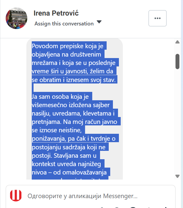 „Povodom prepiske koja je objavljena na društvenim mrežama i koja se u poslednje vreme širi u javnosti, želim da se obratim i iznesem svoj stav. Ja sam osoba koja je višemesečno izložena sajber nasilju, uvredama, klevetama i pretnjama. Na moj račun javno se iznose neistine, ponižavanja, pa čak i tvrdnje o postojanju sadržaja koji ne postoji. Stavljana sam u kontekst uvreda najnižeg nivoa – od omalovažavanja mog moralnog integriteta, preko izmišljenih priča, do pretnji koje su bile krajnje uznemirujuće. Sve to je nanelo veliku štetu meni i mojoj porodici, a posebno mojoj deci, koja su zbog ovakvog terora pretrpela ozbiljne traume. Naglašavam da su sporne poruke koje se dele istrgnute iz konteksta i izmenjene, te da se na taj način manipuliše istinom i stvara slika koja nije verodostojna. Moj odgovor na napade bio je u kontekstu pitanja zašto sam vređana ako nikoga ne diram, i u kontekstu da i deca onih koji me napadaju treba da osete ono što moja deca osećaju dok čitaju sve te uvrede. Nikada nisam imala nameru da vređam niti da pretnjama povređujem tuđu decu, jer smatram da deca nikada ne smeju da budu žrtve postupaka odraslih. Majci deteta sam uputila izvinjenje i za ono što nije bilo pogrdnog karaktera, jer verujem da nijedno dete ne zaslužuje da ispašta. Kao prosvetni radnik, savesno i posvećeno obavljam svoj posao. Nikada protiv mene nije podneta nijedna prijava od strane roditelja ili učenika. Moj rad u školi je uvek bio zasnovan na podršci, saradnji i međusobnom poverenju. Moja dužnost je da brinem o deci i to činim sa najvećom pažnjom i odgovornošću. Ovaj slučaj ne posmatram samo kao lični napad, već i kao deo šireg pritiska u našem malom mestu, ali to ne može i ne sme da bude razlog da se sprovodi teror nada mnom i mojom porodicom, kako bi pojedinci ostvarili svoje političke ciljeve. Smatram da svako ima pravo na političko opredeljenje i lični stav, sve dok on ne ugrožava tuđe pravo na dostojanstvo i miran život. Podsećam da sam zbog konstantnih napada i psihičkog pritiska već bila hospitalizovana, što najbolje govori kakve posledice ovakvo ponašanje ostavlja na čoveka. Ovo što mi se dešava je višemesečni teror koji se ne tiče samo mene, već i moje porodice. Zbog svega navedenog jasno i javno izjavljujem: demantujem poruke koje mi se pripisuju u obliku u kome su objavljene. Nadležni organi će utvrditi šta je prava istina, a ja sam već preduzela sve pravne korake da zaštitim sebe i svoju porodicu. Očekujem da se moja izjava u medijima prenese u potpunosti i bez izmena. Za svako izvrtanje, skraćivanje ili iznošenje u obliku koji nije izvoran – biće pokrenuti odgovarajući pravni postupci. Nema potrebe da se u ovaj slučaj uvlače bilo kakvi funkcioneri ili političke strukture, jer je ovo individualna stvar. Ono što očekujem jeste da se prekine višemesečno targetiranje, sajber nasilje i pokušaji mog javnog ponižavanja. Moj prioritet ostaje moj rad sa decom, moj profesionalni integritet i moja porodica. Sve neistine i manipulacije prepuštam nadležnim institucijama”.