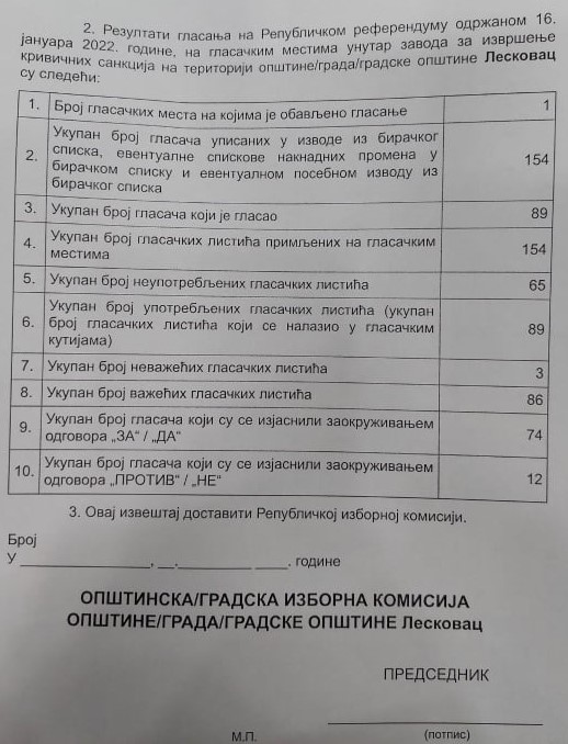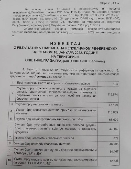 Inače, umesto GIK-a, konačne rezultate referenduma u Leskovcu saopštio je SNS.