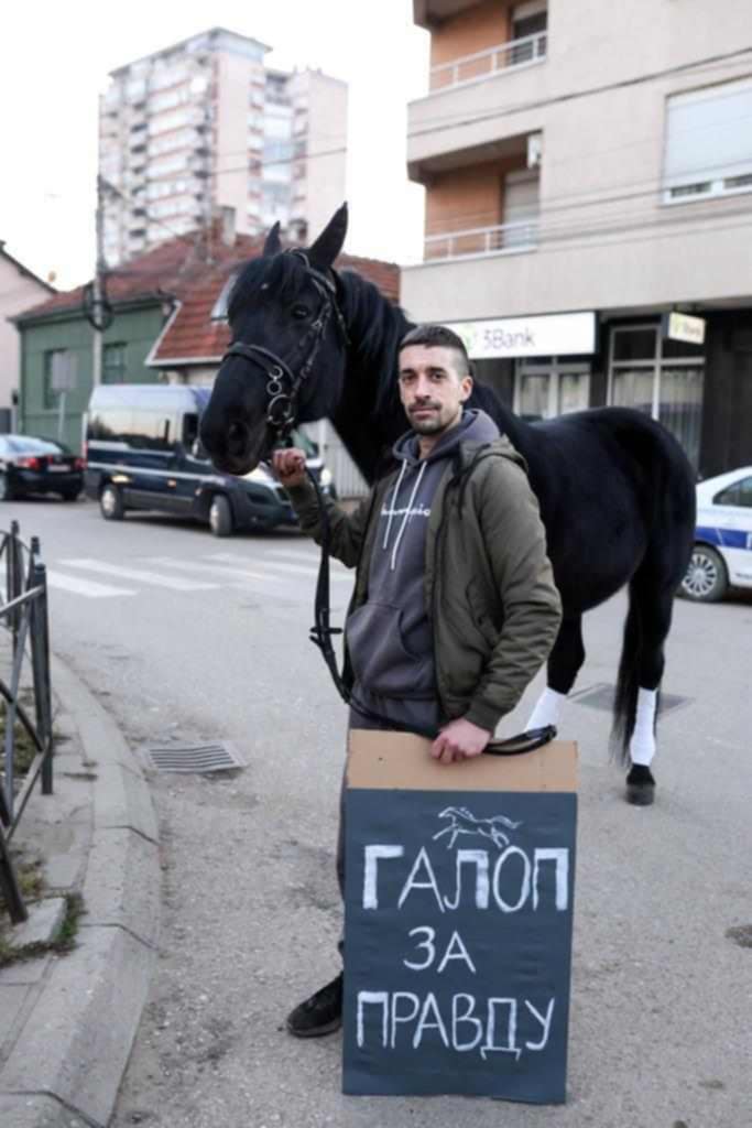 “Galop za pravdu” parola je sa kojom je Nikola Pejić pokušao da se pojavi na poslednjim studentskim protestima u Leskovcu, i to na pravom konju, ali ga je u tome sprečila policija.