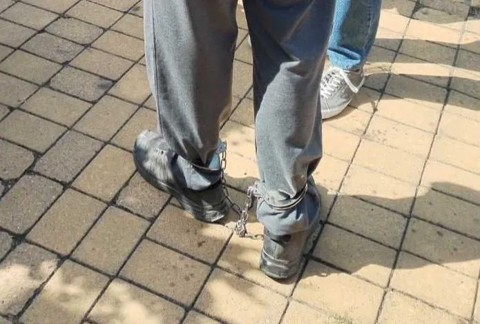 Slika jasno pokazuje Golubovića kako ide slobodno, bez fizičkih ograničenja, dok su u slučaju Jovičića lanci bili vidljivo stavljeni na noge.