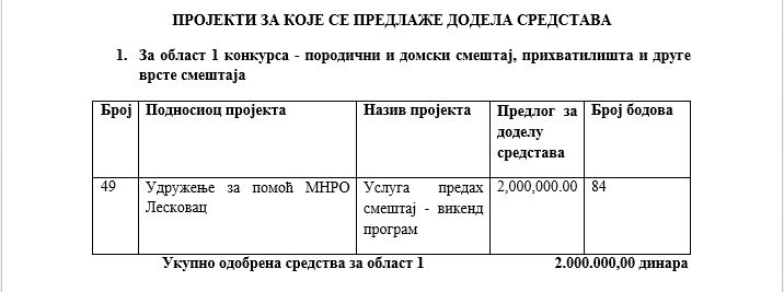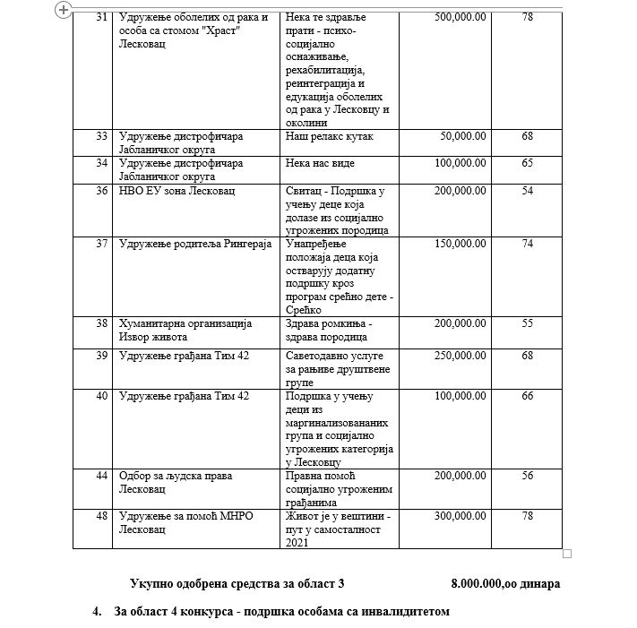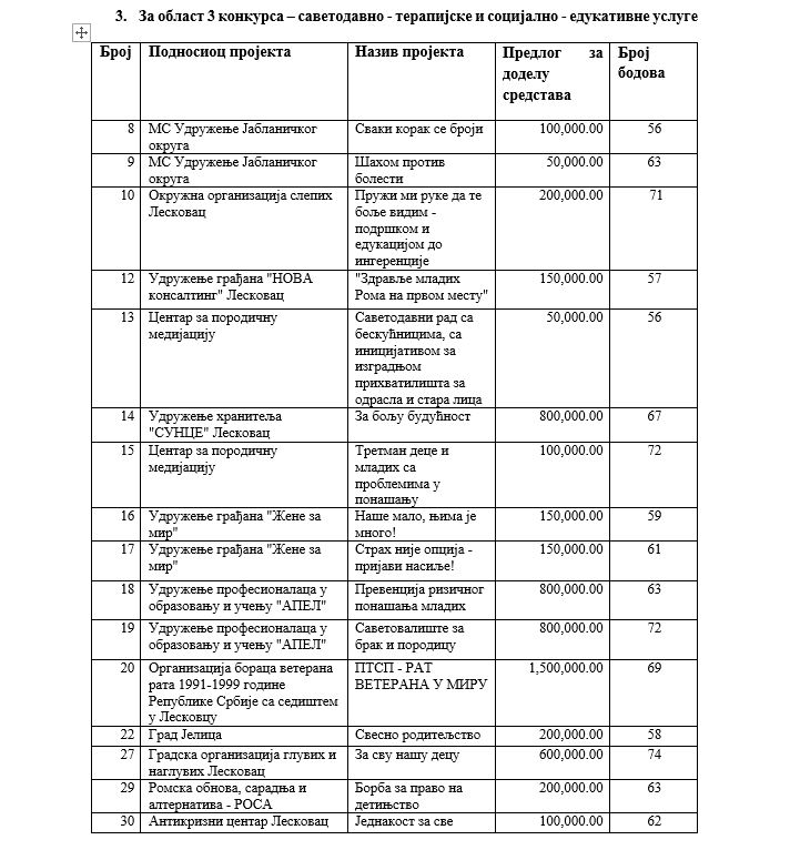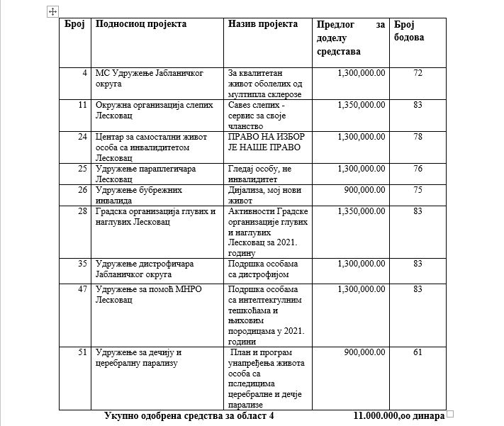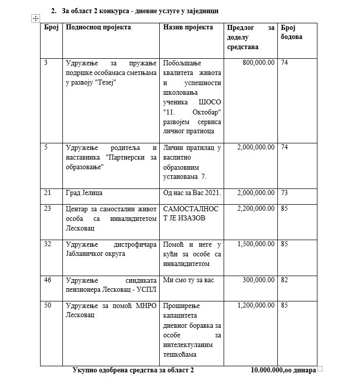 Po tom predlogu, najviše, i to za dva projekta, dobiće Udruženje za pomoć MNRO Leskovac – 3,2 miliona, Centar za samostalni život osoba sa invalisitetom – 2,2 miliona i Udruženje roditelja i nastavnika “Partnerski za obrazovanje i Grad Jelica – 2 miliona dinara.