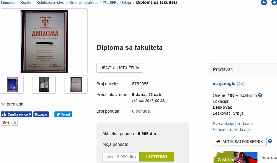 “Hteli bi da postanete profesor, direktor javnog preduzeća, poslanik u skupštini, ministar ili čak predsednik države? Ambicije i planovi za tako nešto vam ne nedostaju, ali vam nedostaje diploma”, navodi se u oglasu na sajtu Limundo gde možete izlicitirati za pravu diplomu sa niškog Fakulteta sporta i fizičkog obrazovanja.