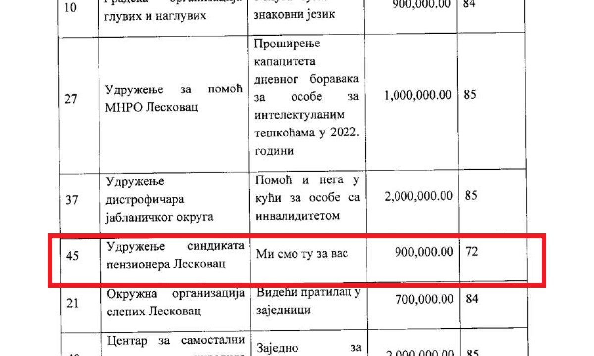 Ovo udruženje za projekat pod imenom “Od nas za vas” već godinama dobija milione iz leskovačke gradske kase. Ove godine su dobili 2,5 miliona, prošle za istoimeni projekat 2 miliona, a verovali ili ne, za istoimeni projekta su dobili sredstva i 2017. godine i to u iznosu od 890.000 dinara.