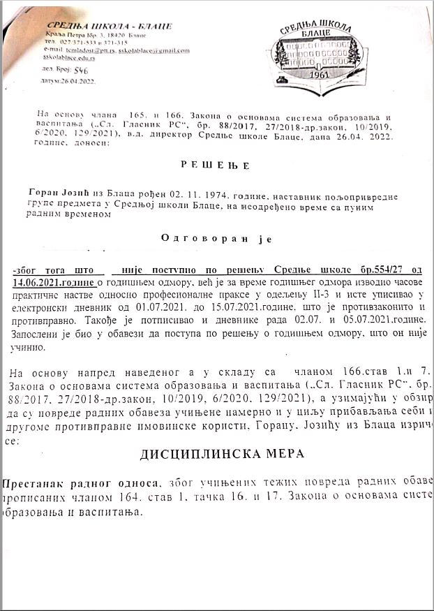 Goran Jozić, diplomirani inženjer poljoprivrede iz Blaca, dobio je rešenje o otkazu u Srednjoj školi u Blacu, gde je godinama zaposlen kao nastavnik poljoprivredne grupe predmeta, samo zato što je postupio po rešenju tadašnjeg direktora da tokom svog godišnjeg odmora drži stručnu praksu učenicima. Ono mu je uručeno ovih dana, a Jozić kaže da će se na to rešenje, koje je potpisao v.d. direktora Nebojša Stevanović žaliti Školskom odboru. Da paradoks bude veći, prema našim saznanjima i v.d. direktora Stevanović je kao i Jozić, držao praksu učenicima tokom svog godišnjeg odmora. Stevanović nije želeo da komentariše ni rešenje, ni naša saznanja.