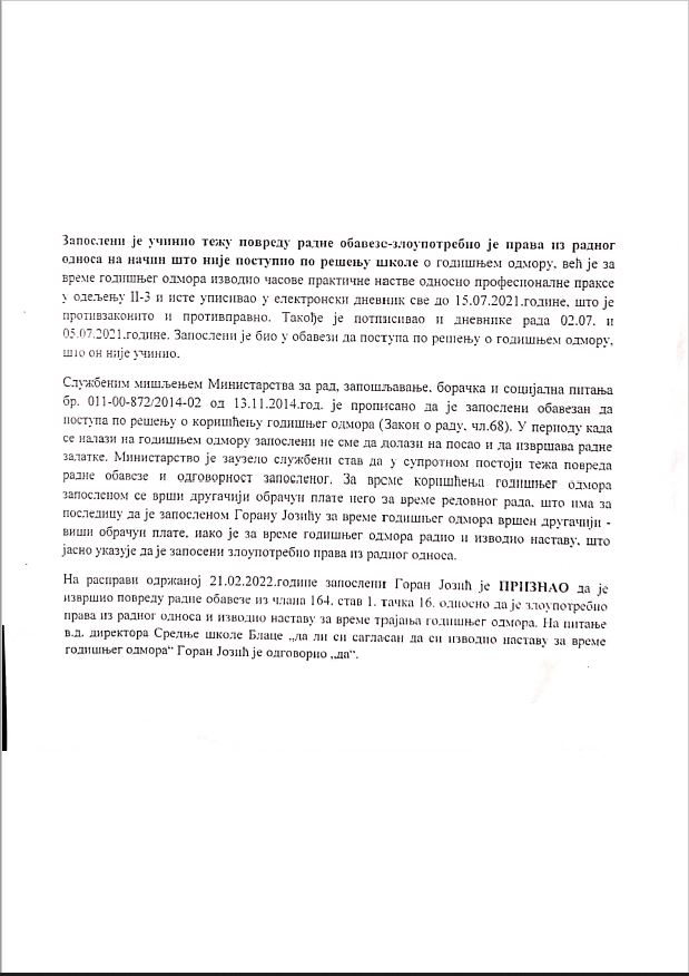 “Pošto mi odmor nije prekinut časove sam održao jer u suprotnom nastava u tom odeljenju ne bi bila završena do kraja, učenici ne bi imali zaključene ocene i ne bi bilo moguće utvrditi opšti uspeh učenika a ja bih sigurno bio disciplinski procesuiran jer nisam ispunio svoje obaveze po rešenju i rasporedu škole za ono za šta sam plaćen. Radio sam apsolutno onako kako su radile i ostale kolege kao i sam v.d.direktora koji mi je zbog toga uručio otkaz ugovora o radu da pritom ni postupak nije sproveo do kraja, čak i bez ikakvog prethodnog upozorenja”,dodaje Jozić.