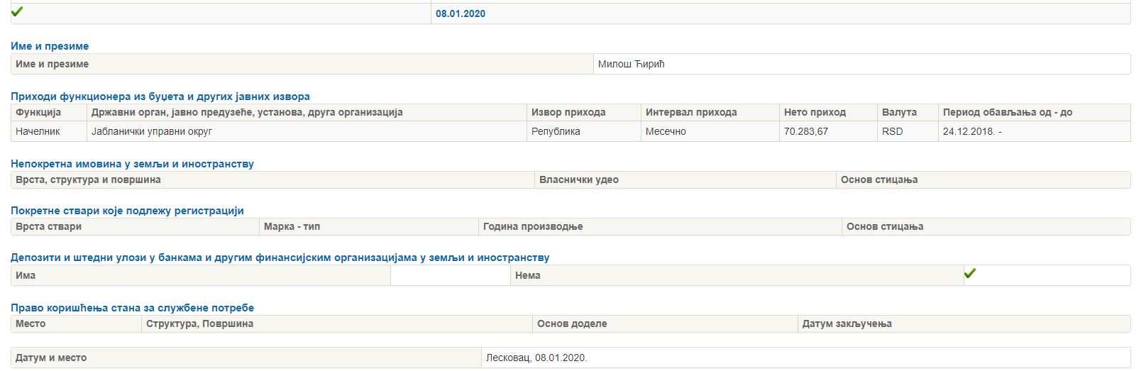 Ako pogledamo imovinske karte čelnika Jablaničkog okruga, sasvim je moguće da se zapitate istu stvar. Tako, na primer, načelnik Jablaničkog okruga Miloš Ćirić nema na svoje ime ubeleženu nijednu nepokretnost, ni u zemlji ni u inostranstvu, ni automobile, ni motor, pa čak ni biciklu, a njegova primanja su najskromnija od svih lokalnih vlastodržaca i iznose svega 70.283 dinara.