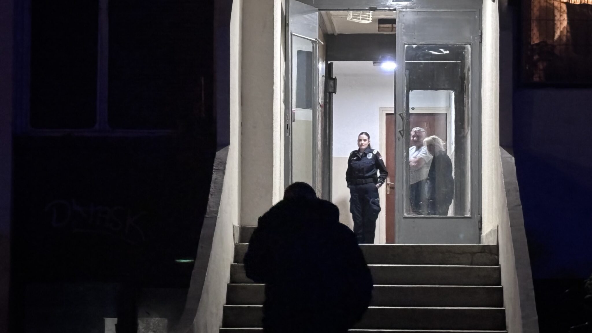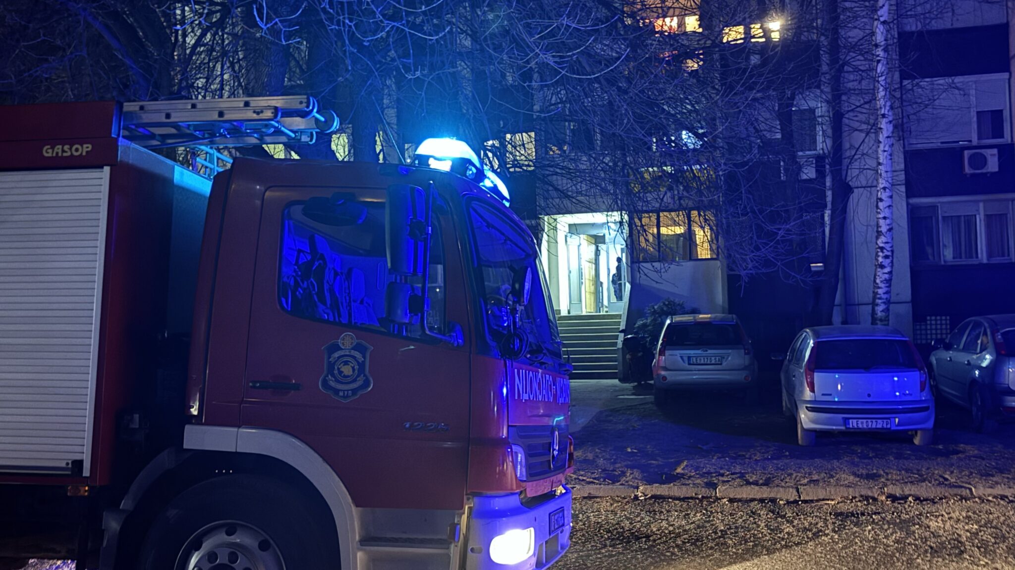 Na lice mesta brzo su stigli pripadnici vatrogasno-spasilačke jedinice i policije, dok stanari zgrade tokom intervencije čekaju u hodniku.