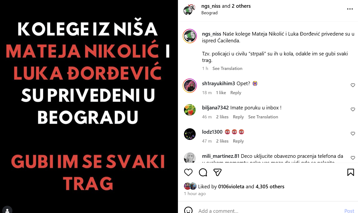 „Policajci u civilu su ih strpali u kola, odakle im se gubi svaki trag“, navodi se u objavi Samoorganizovane neformalne grupe studenata na Instagramu.