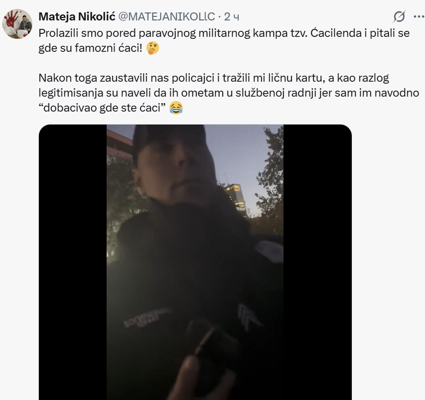 Pre privođenja, Nikolić je na društvenoj mreži Iks (X) objavio video snimak na kome se vidi kako ga policajac legitimiše. U opisu snimka napisao je da su mu policajci tražili ličnu kartu, navodno zato što ih je „ometao i dobacivao im“.