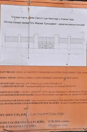 Na tabli se, osim naziva projekta, nalazi i ilustracija te novosadske ograde, dok je vrednost radova navedena kao 22,4 miliona dinara. Kao početak radova upisan je 12. avgust 2024. godine, a rok za završetak — 120 dana.