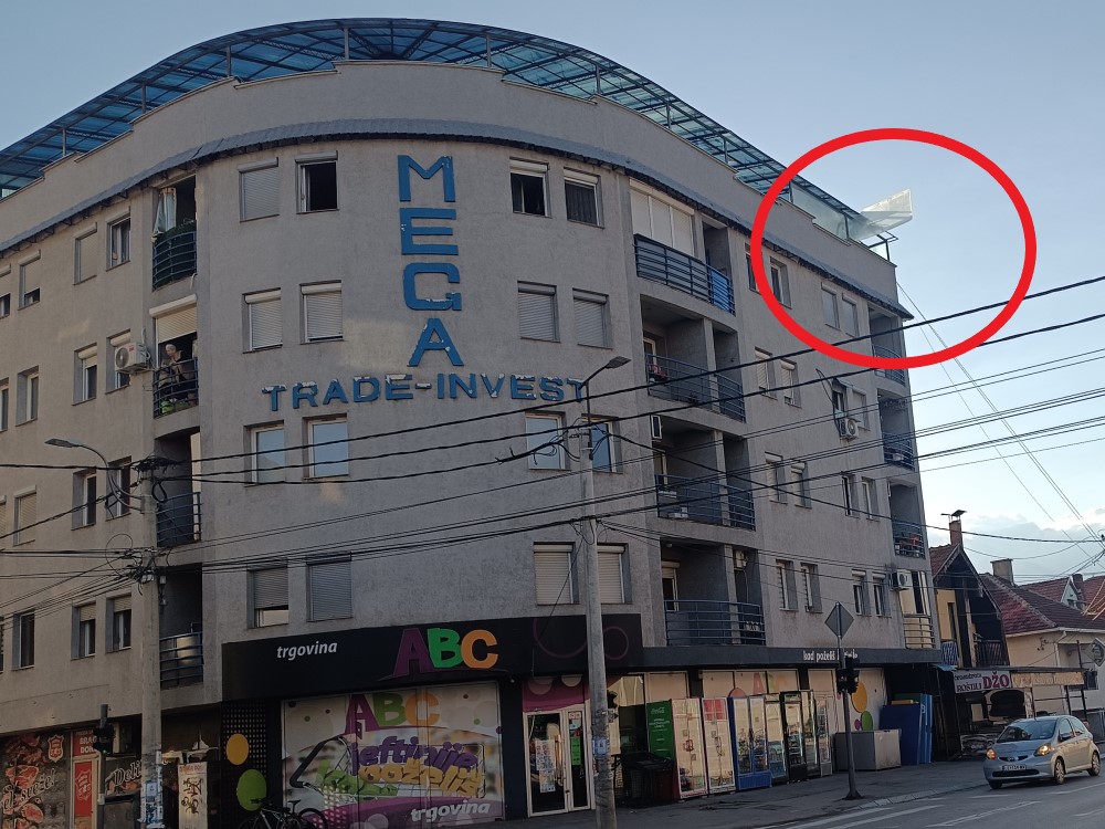 Problem je, kako navode čitaoci Rešetke, koji su nam i poslali ove fotografije, to što profesionalni upravnik nema kontakt sa vlasnicom koja je u inostranstvu, a takođe niko nema ključ tavanskih prostorija kako bi se popeo i sklonio tablu.