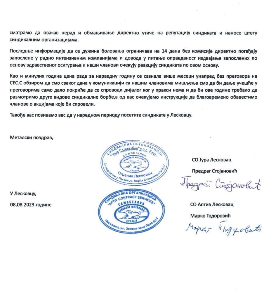 “Po svedočenju bivših zaposlenih u ovoj turskoj kompaniji, još u prvoj godini poslovanja je bilo inicijative za pokretanje sindikalne organizacije, ali kolege iz ‘Džinsija’ su dobile lažne pristupnice od Gradskog veća SSSS Leskovac koje nemaju veze sa SSSS, niti bilo kojom granom u strukturi sindiokata po već viđenom modelu u slučaju Jure Leskovac”, dodaje se u saopštenju.