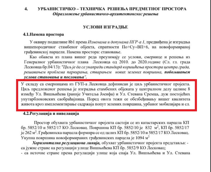 Uvidom u obrazloženje urbanističko-arhitektonskog rešenja Urbanističko –tehničkog rešenje predmetnog prostora Generalnog urbanističkog plana grada Leskovca, za sporni prostor je upisano da se “teži obezbeđivanju višeg kvaliteta života kroz implementiranje sadržaja poput zelenih površina, urbanog mobilijara i slično”.