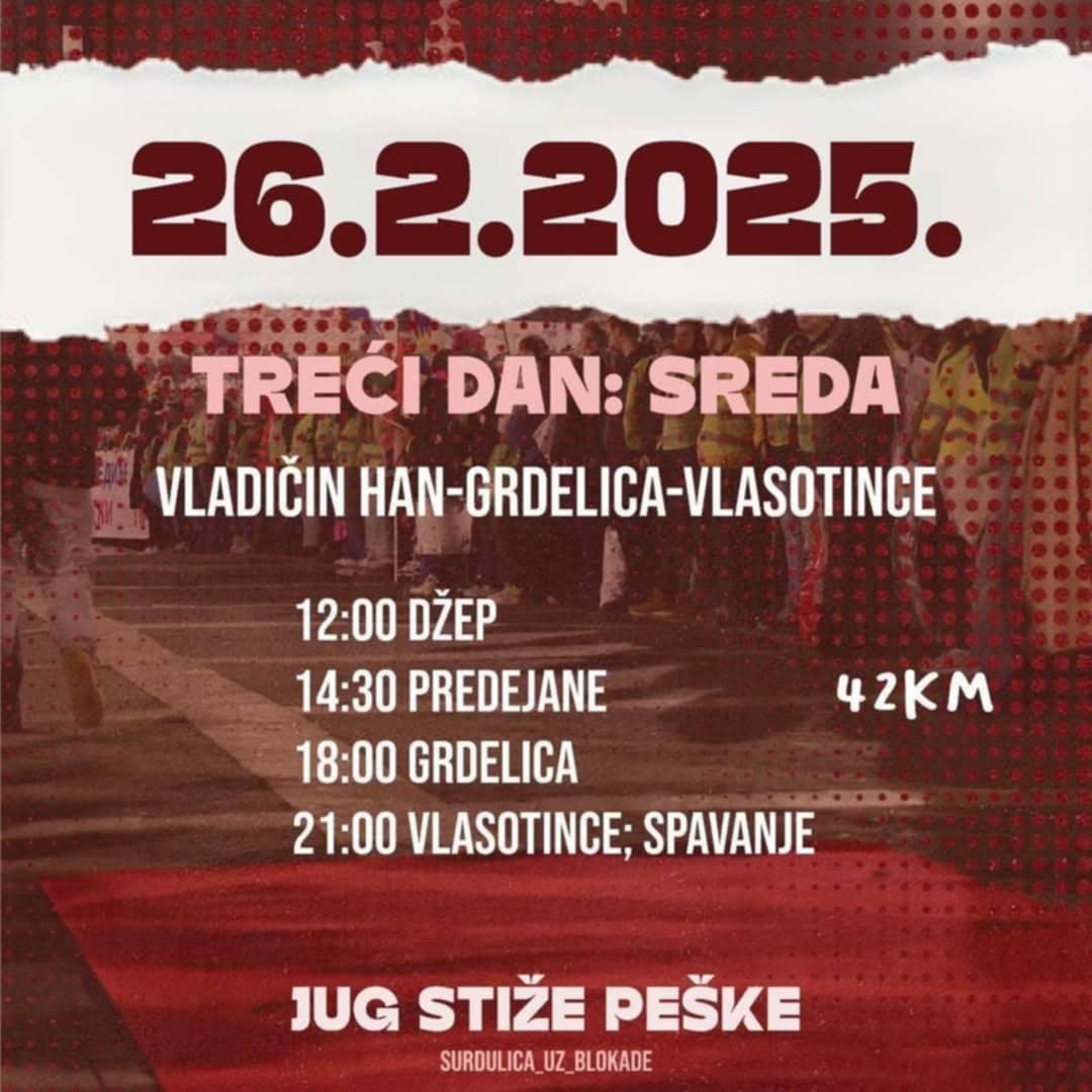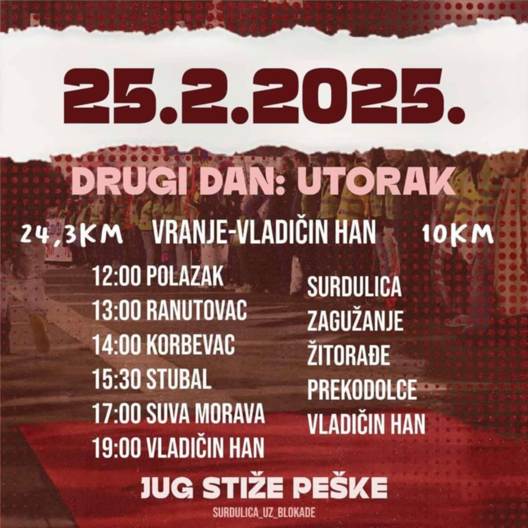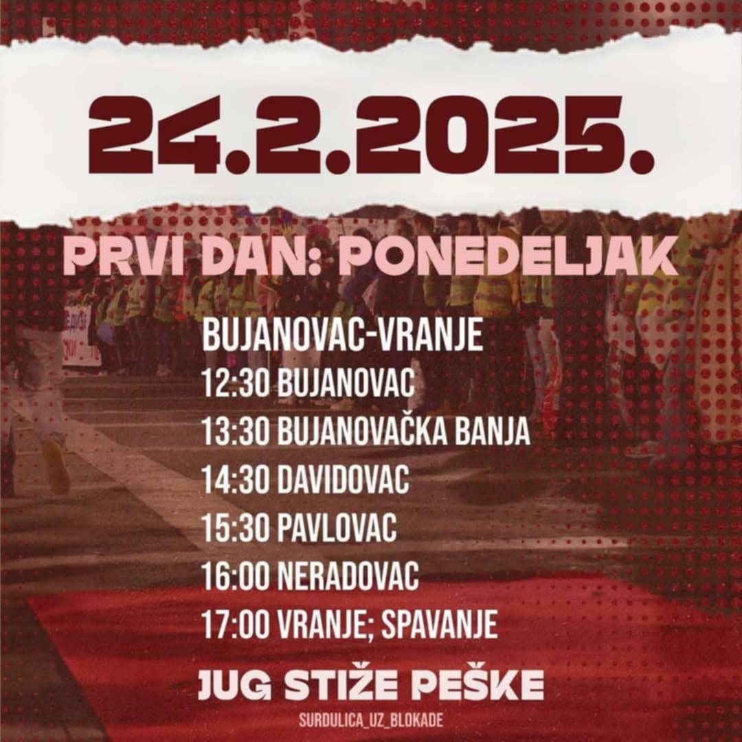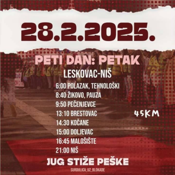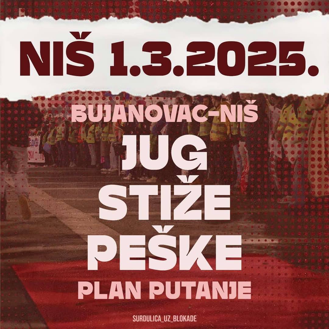 Studenti iz Bujanovca, Vranja, Vladičinog Hana i Surdulice koji sutra kreću pešaka na veliki protest u Nišu 1. marta, dan ranije stižu u Leskovac, gde će i prespavati, a zatim zajedno sa studentima iz Leskovca i Vlasotinca, u kojem će takođe ranije noćiti, nastavljaju svoj put do krajnjeg cilja.