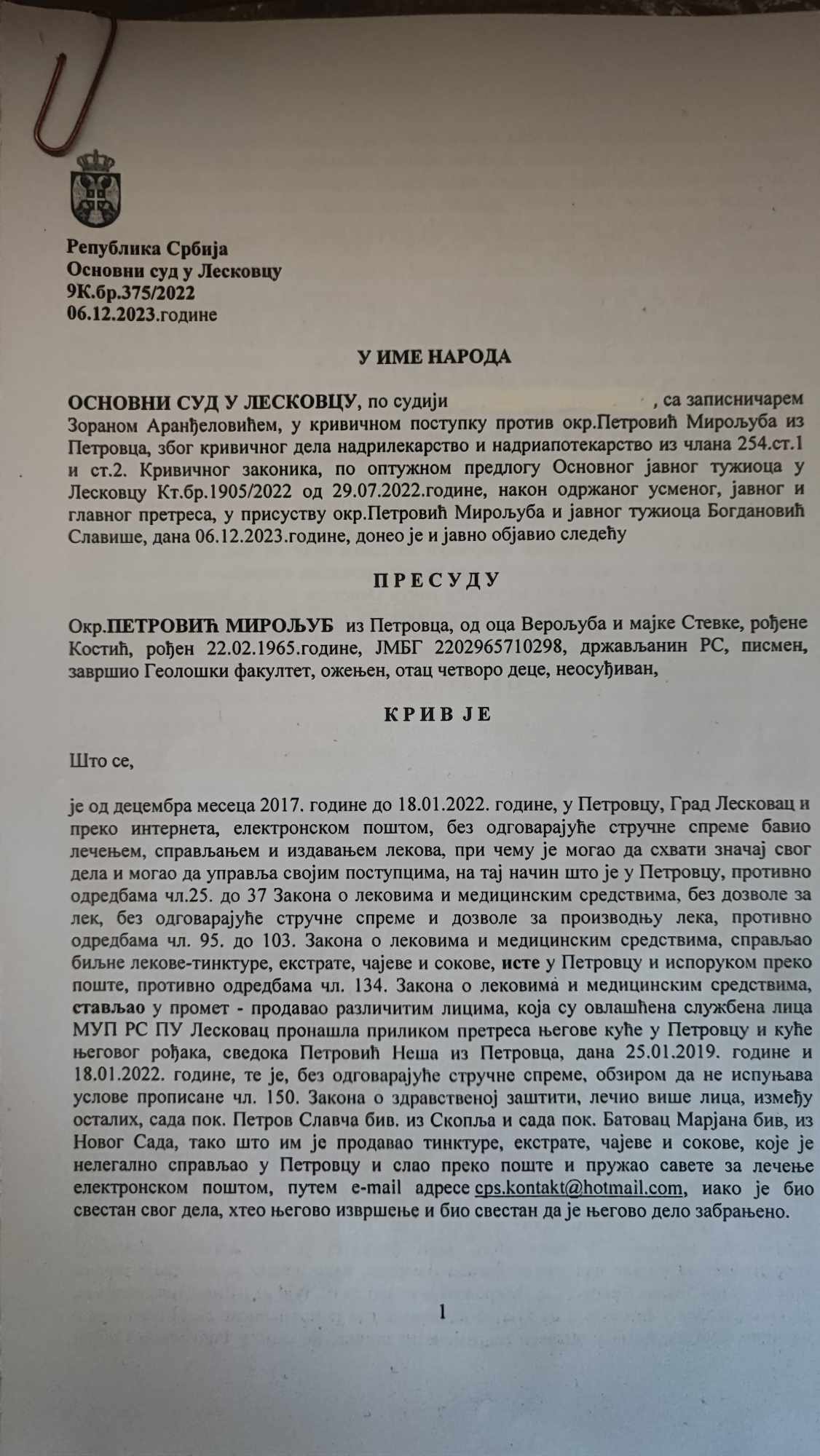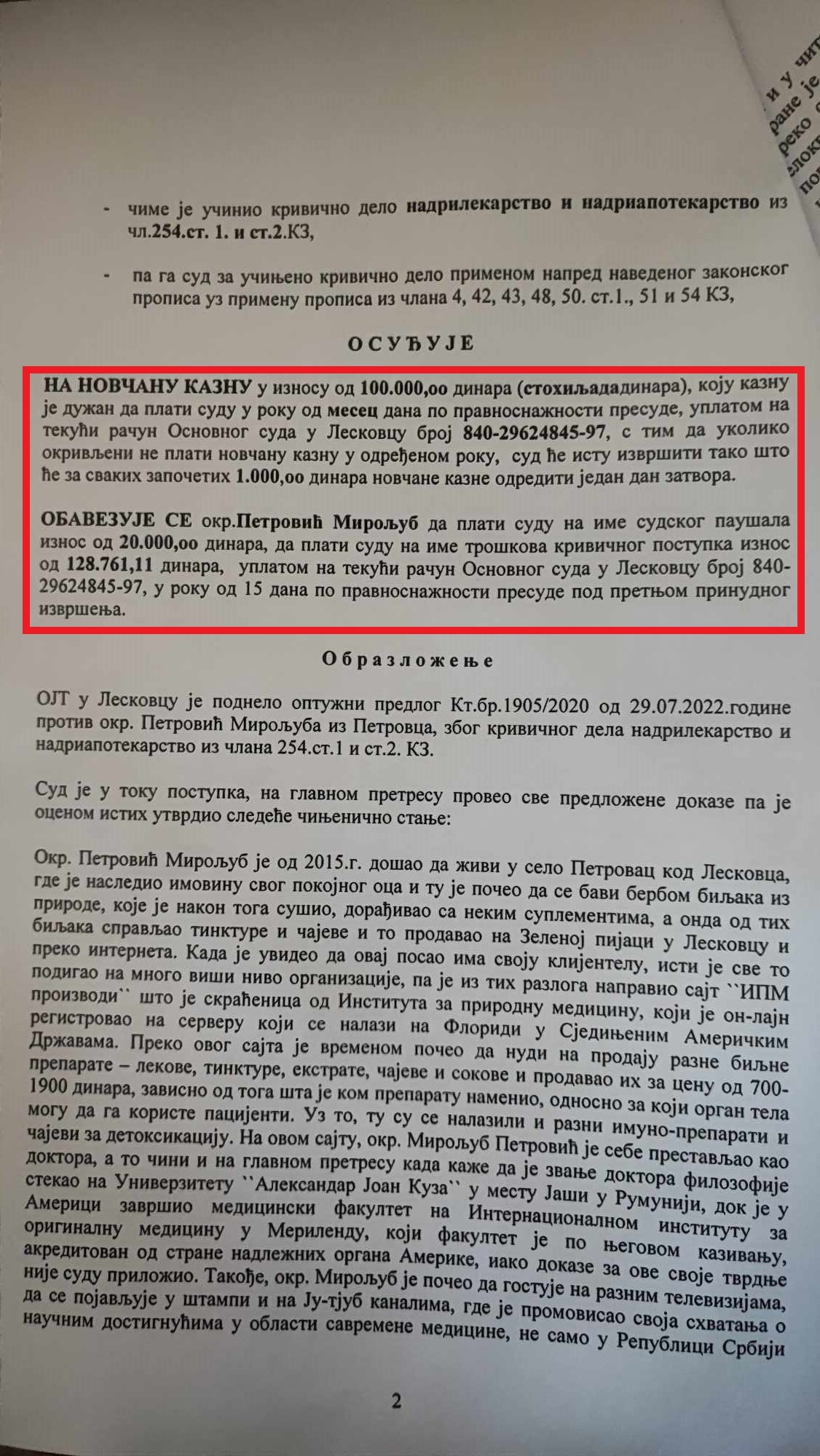 “Provao ih je po cenama od 700 do 1.900 dinara, zavisno od toga šta je kom preparatu namenio, odnosno za koji organ tela mogu da ga koriste pacijenti. Uz to su se nalazili i razni imuno-preparati i čajevi za detoksikaciju”, navodi se u obrazloženju presude.