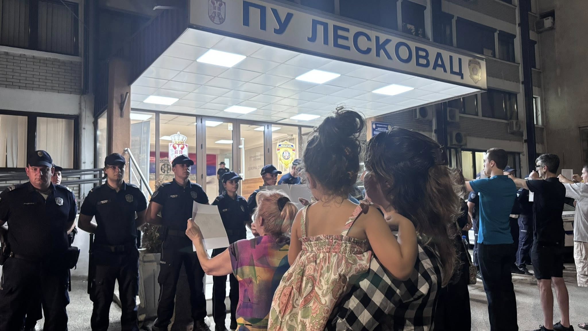 Građani Leskovca večeras su se okupili na Gradskom trgu, odakle su krenuli u protestnu šetnju. Tokom kretanja gradskim ulicama zaustavili su se ispred zgrade lokalne samouprave i Policijske uprave, gde su policijskim službenicima, koji su obezbeđivali ulaz, pokazivali fotografije građana iz drugih gradova povređenih tokom policijskih intervencija. Okupljeni su tom prilikom skandirali „Mesko, odlazi“.