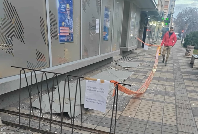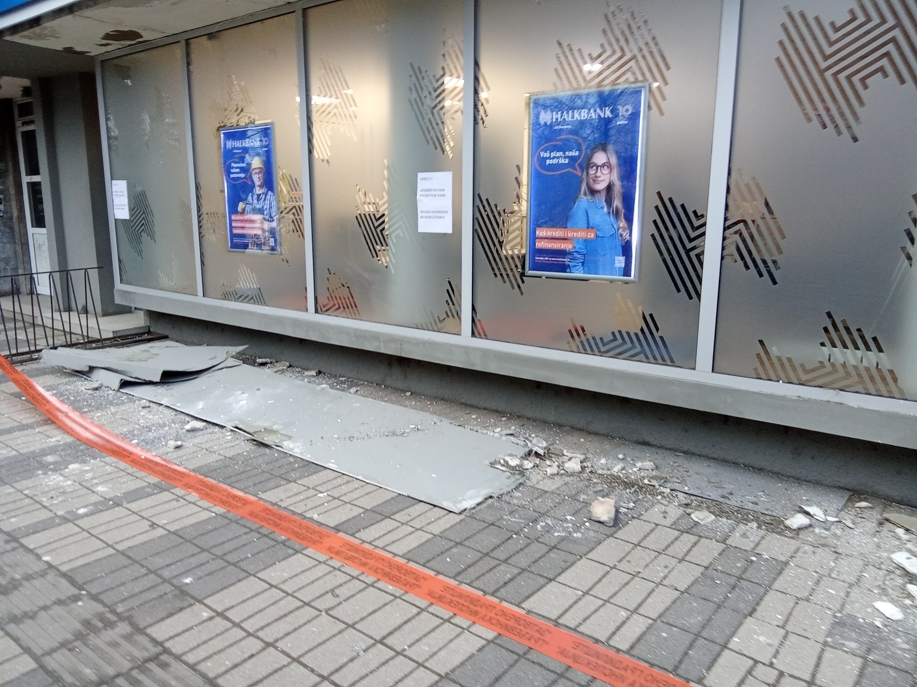 Deo fasade lokala u kome se trenutno nalazi „Halk“ banka obrušio se i pao na trotoar, na kojem na svu sreću, u tom trenutku nije bilo pešaka, a dvadesetak metara dalje, u prolazu ispred zgrade, sa plafona su počeli da padaju delovi maltera.