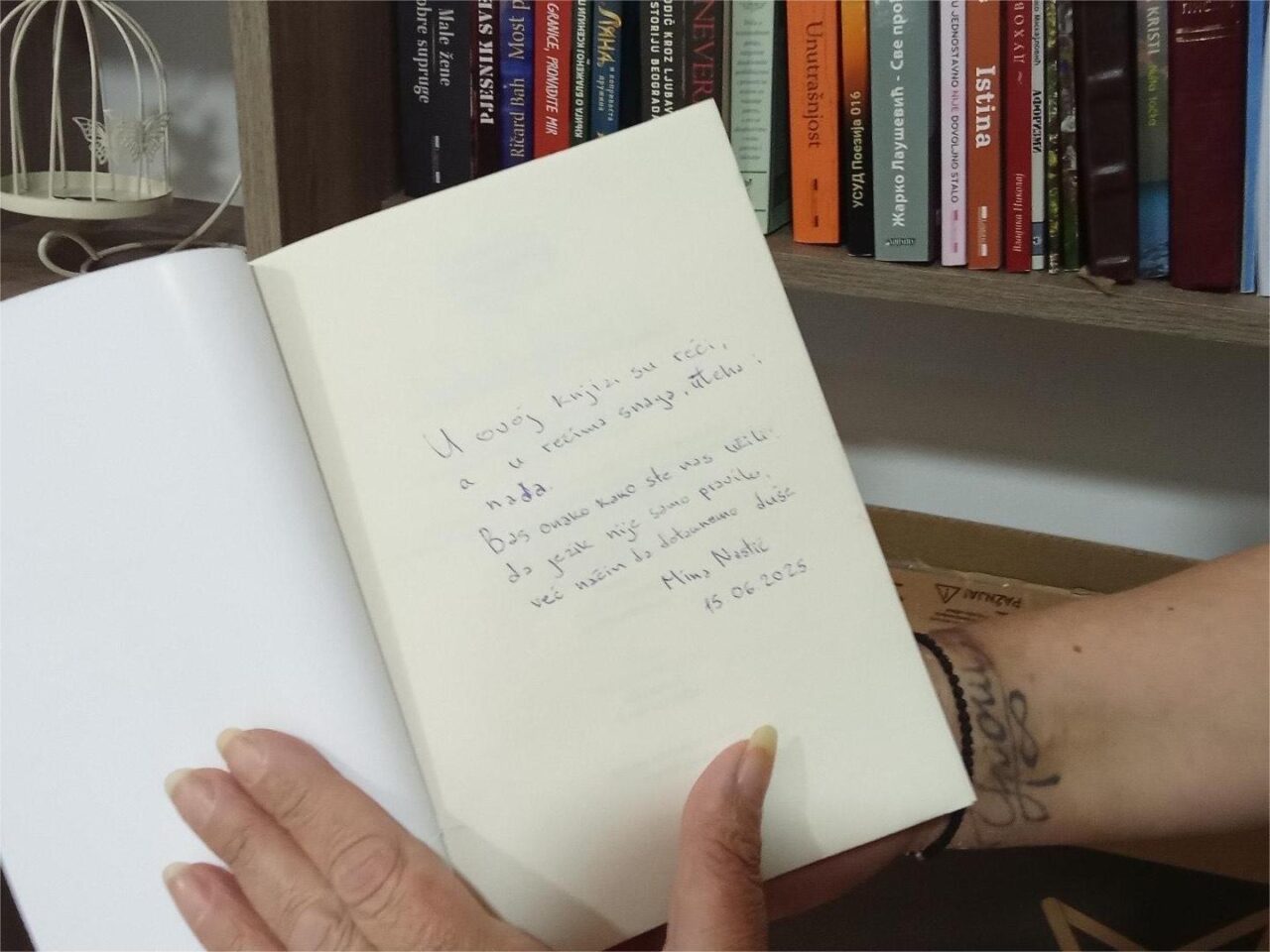 “ Znajući to, moji su učenici pokrenuli akciju. Doniraju mi knjige i svaka je sa posebnom posvetom. To me dovelo do suza. Neko je donirao ikonu, a roditelji mojih učenika želeli su da doniraju nešto lično, pa je to srebrni lanac sa priveskom na kome je lik Bogorodice. Tolika ljudska empatija, tolika humanost, uverili su me da, iako živimo u vreme opšte otuđenosti, dobrih ljudi itekako ima. Većina onih koji su pomogli meni i mojoj porodici, javili su se sami i ponudili pomoć. Još jednom, svima zajedno i svakom pojedinačno, hvala od srca za pruženu još jednu šansu za dostojan život“.