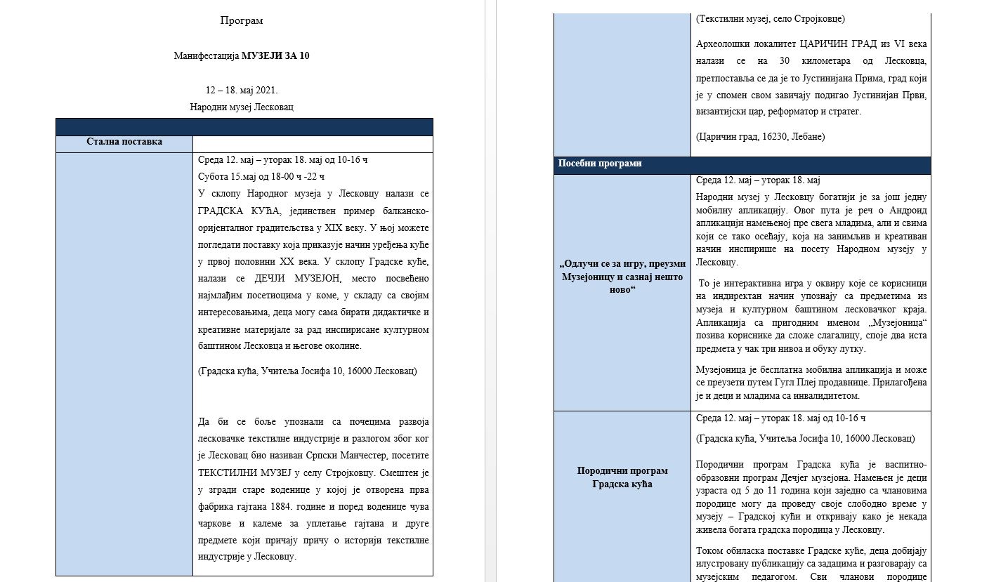 Narodni muzej Leksovac učestvuje u nacionalnoj muzejskoj inicijativi Muzeji za 10, koja se ove godine po sedmi put održava pod pokroviteljstvom Ministarstva kulture i informisanja, a koordinacijom Nacionalnog komiteta Međunarodnog saveta muzeja – ICOM Srbija.