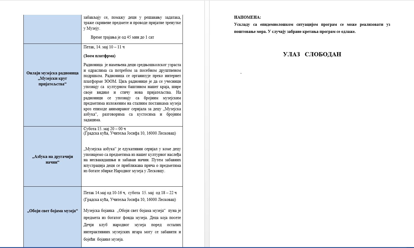 Radno vreme muzeja: 12. maj – 18. maj od 10-16 č